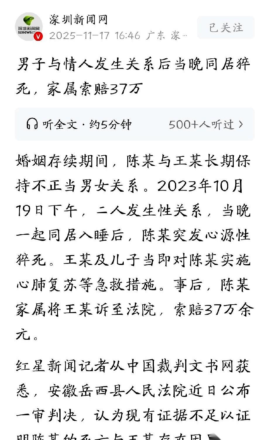 人没了,最后情人赔了3万块。 你以为是赔命钱?不,法院说这叫“精神损害抚慰金”。 这事儿真是……魔幻。 一个四十多岁的男人,有家有室,自己身体底子又不好,还重感冒发烧。 医生千叮万嘱要休息,他倒好,转头就非要跟情人“为爱鼓掌”。 结果呢? 完事儿就腿软、发抖,他还乐呵呵以为是感冒后遗症,没当回事。 心是真大。 然后,半夜人就直接过去了。心源性猝死。 情人也吓傻了,又是人工呼吸又是打120,能做的都做了,但神仙也救不回来了。 这下好了,原配家里炸了锅,直接把情人告上法庭,要37万。 逻辑也挺简单:要不是你勾引他,要不是你没拦着他,他能死吗?! 法院审了半天,判决特别有意思。 先是说,他一个成年人,自己身体什么样自己不清楚?非要拿命去作,这个责任情人不背。而且情人发现不对劲也叫了救护车,尽到义务了。 所以,人的死,跟情人没有法律上的直接关系。 但是!话锋一转。 法院说,你俩这见不得光的关系,本身就严重违背了公序良俗,给人家家庭造成了巨大的精神伤害。 所以,虽然你没“杀人”,但你“诛心”了。 来,这3万块,你掏了吧,算是个道义上的交代。 你看,这判决多有水平。 法律管不了风花雪月,也判不了生死簿,但道德的账,最后总得有人算一算。 他呢,用生命践行了什么叫“牡丹花下死”。 她呢,用三万块给这段不该有的感情,买了张昂贵的、带着血的收据。