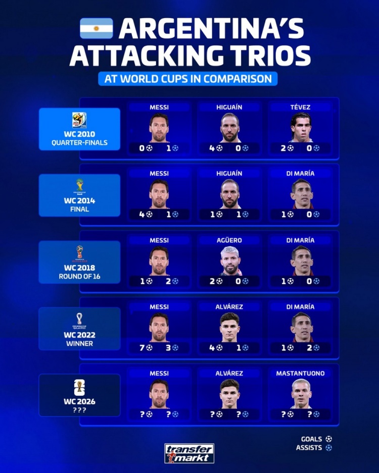 直播吧11月19日讯德国转会市场列出了阿根廷队近5届世界杯的锋线三叉戟,并预测明年世界杯梅西、阿尔瓦雷斯、马斯坦托诺在锋线搭档。