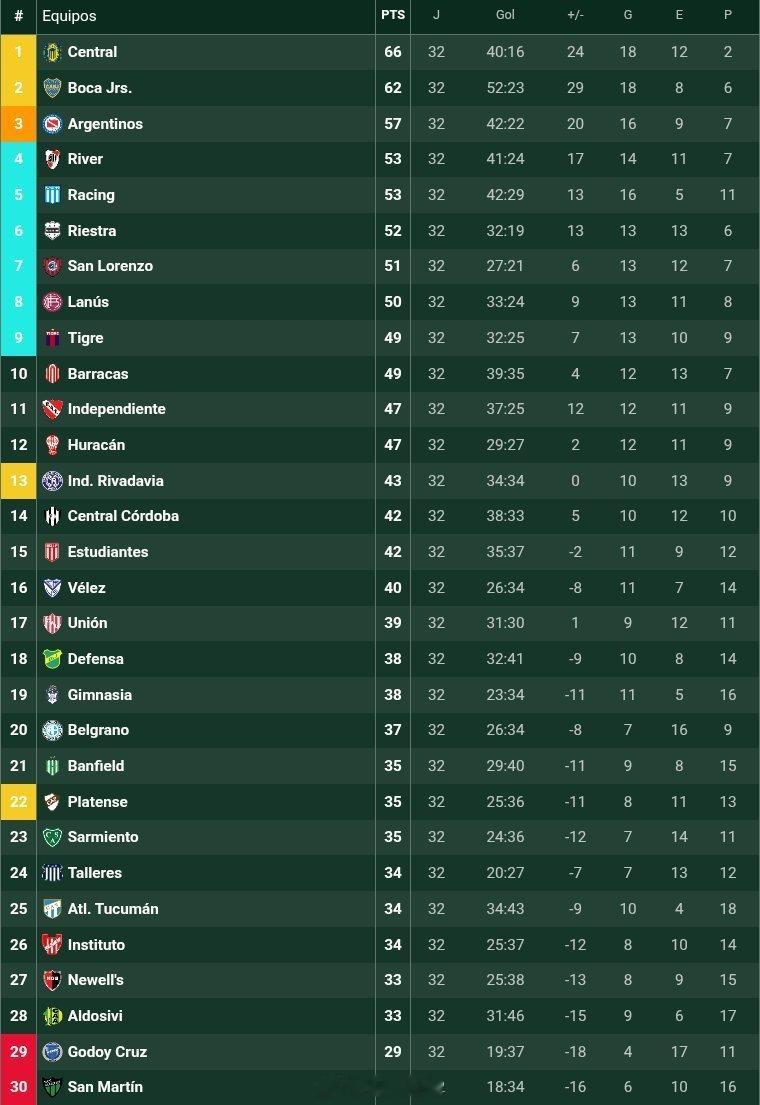 🏆阿根廷甲级联赛小组赛最后一轮结束后的最终排名🇦🇷黄色 - 获得南美解放者杯参赛资格 :罗萨里奥中央、博卡、青年人橙色 - 获得南美解放者杯附加赛参赛资格天蓝色 - 获得南美杯参赛资格: 河床竞技圣洛伦索等5家。红色 - 降级至乙级联赛: 戈多伊克鲁斯、圣马丁。