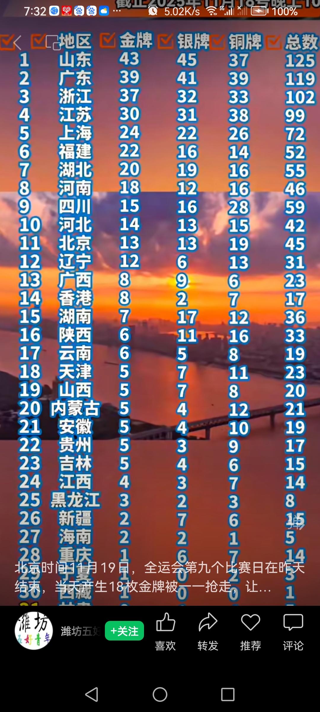 友谊第一,比赛第二 全运会奖牌榜名单 第十五届全运会奖牌榜情况如下(数据截至11月18日22时):