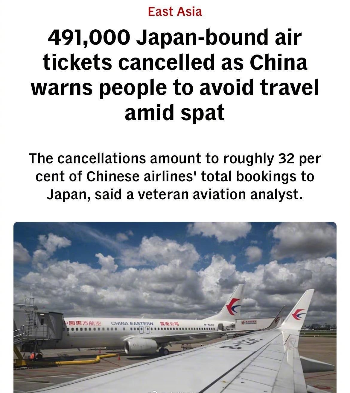 据称,因中日争端升级,已造成49万张赴日机票被取消,占中国航司相关预订量约32%。
