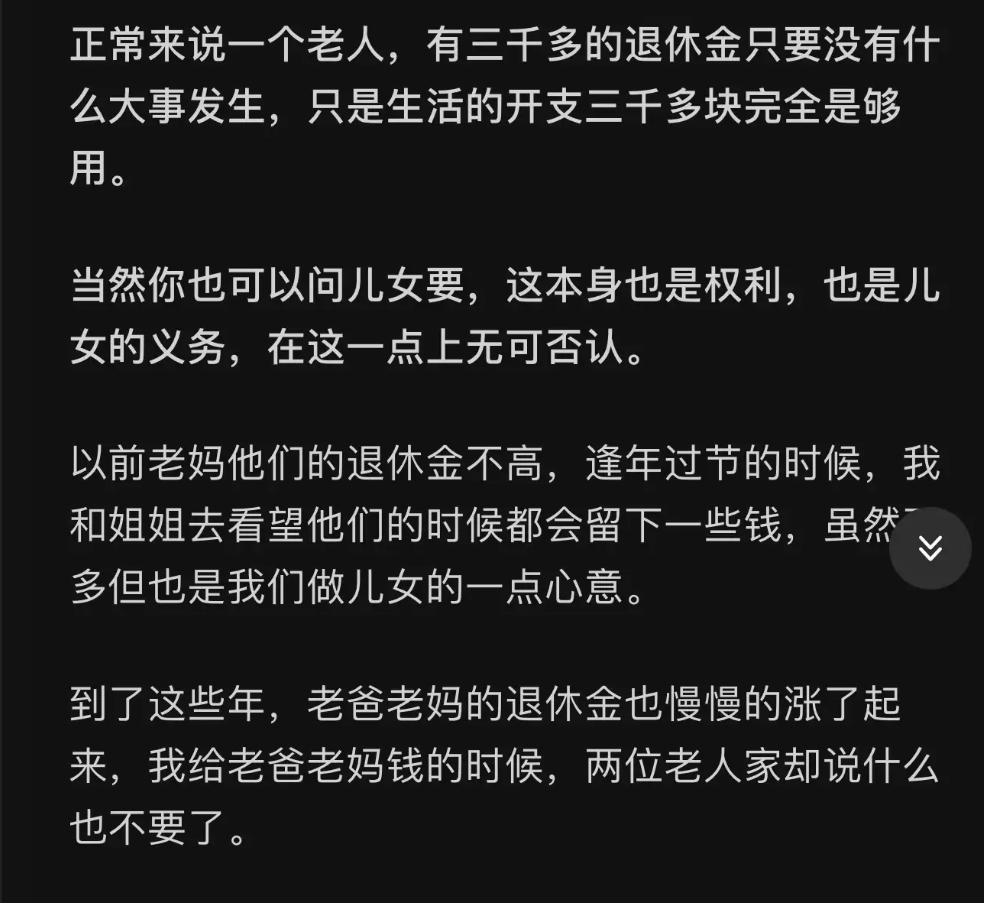 每月3000退休金不够花?还要找儿女要钱!网友一句话撕开现实:这样的父母,真能帮子女买房? 都说退休了该享清福,可一位大叔发愁:每月3000多退休金,根本不够花,该不该向儿女开口要钱? 热心网友直接给他算了一笔账:来东北小城住,一天80包吃包住还带温泉,麻将打一毛的、唱K爬山随便玩,一个月下来基础花销2400,还剩600零花——这不比在大城市硬扛香? 但真正引发热议的,是下面这条神评论: “那些口口声声说‘儿女别靠父母,自己买房买车’的人,结果自己退休金3000都不够用,还得伸手找孩子要——你这消费水平,年轻时真能攒下钱帮孩子吗?” 话糙理不糙!能帮儿女扛首付、凑车款的父母,绝大多数都是精打细算、勤俭一辈子的人。除非大病烧钱,正常情况哪会三千块都撑不住一个月? 反观有些父母,一边喊“儿女要独立”,一边退休后反而成了“啃小族”……是不是有点双标? 说到底,不是不能要,而是得看情况。 如果真是医疗刚需,儿女该掏必须掏; 但如果是因为消费高、图享受,那真得摸摸良心:年轻时有没有为儿女拼过? ▂ 会攒钱的父母,很少喊“钱不够”; ▂ 真心为子女的,早把路铺到了后半程。 养老现实 退休金 啃小族 家庭责任 代际关系 消费观 不是儿女不孝顺,是有些父母,从来没学会“量入为出”。