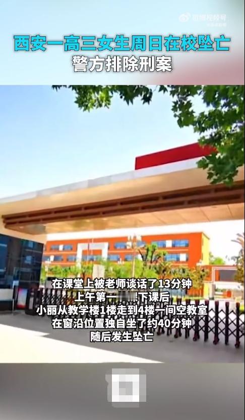高三的学生在周日补课期间,竟然发生了意外,这个错该谁去承担? 事情发生在10月26日,当时是个周日,西安一所职高的高三学生孩子上课中, 高三的一名女学生小丽(化名)因为英语作业没有按时完成, 在课堂上被老师点名并谈话了将近13分钟, 之后这名女学生的情绪都比较低落,整堂课都没有抬头听课, 下了课之后,这名女学生就从班级(班级在一楼)走到了四楼的一间空教室, 然后坐在窗户边,四十分钟后竟然发生了坠楼事故,抢救无效身亡! 在学校竟然发生了这样的事情,是学生的心理脆弱还是老师的谈话打击性太大? 这个可以先放到一边,毕竟一名高三的学生发生了坠楼事故,真的是太可惜了, 家长辛辛苦苦的养育了十几年,终于等到了可以考大学的时候,但却在最关键的时刻发生了意外, 这让家长怎么去接受这个事实?首先对家长来说真的是太残忍了。 其次老师在班里边当着全班同学的面去和该名女生去谈话,是不是严重打击了孩子的自尊心? 要知道都高三的女孩子了,自尊心还是非常的强的, 当时13分钟的谈话内容大家也可想而知, 无非是作业为什么不完成? 都高三了还只想着玩, 你对得起父母和老师吗这类的话语....... 该名女生会选择坠楼,说明老师在课堂上批评的话语还是非常的严重的。 对于学校的安全问题,也是非常值得商讨的, 一名学生坐在窗户边上长达四十分钟,竟然没有一个人发现?学校的安全是有漏洞的, 如果学校能及时发现该名学生或者老师在课堂上发现少了一名学生而及时去寻找, 也不至于会发生这样悲惨的事件。 学校对此事表现的非常的中立,称双方的律师已经在对接,对孩子家属没有什么可说的? 句句冰冷的话语,更是让家长心寒, 毕竟孩子是在学校出的事,校方一定是有责任的。 有人也说了,周末了为什么还会补课?这与教育思想不匹配呀, 其实对于高三的学生,这个时候补补课也是有好处的,毕竟马上就要高考了, 据说周六学校放假,英语老师留了作业,但该名学生去和同学玩了,作业没有完成, 就导致了周日回到学校的时候,因为作业没有完成被老师罚抄, 并且在课堂了进行了长达13分钟的谈话,最终导致了严重的后果。 针对以上事件,我觉得双方都有责任的: 第一:先不说学校周日补课,但老师在课堂上当着所有同学的面和该名女学生谈话,这个方法不可取,毕竟这个时候的女孩子自尊心比较强,应该是在办公室或是教室外边单独谈话。 第二:该名学生坐在四楼的窗户边长达40分钟,学校的老师竟然都没有发现,这也说明了学校的安保有问题。 第三:家庭教育也出了问题,其实这种在学校的谈话,按照正常来说,每个学生的心理都应该能接受,不能因为被老师谈了话,心理就承担不了,出现了这样的事故,家长也应该反思。