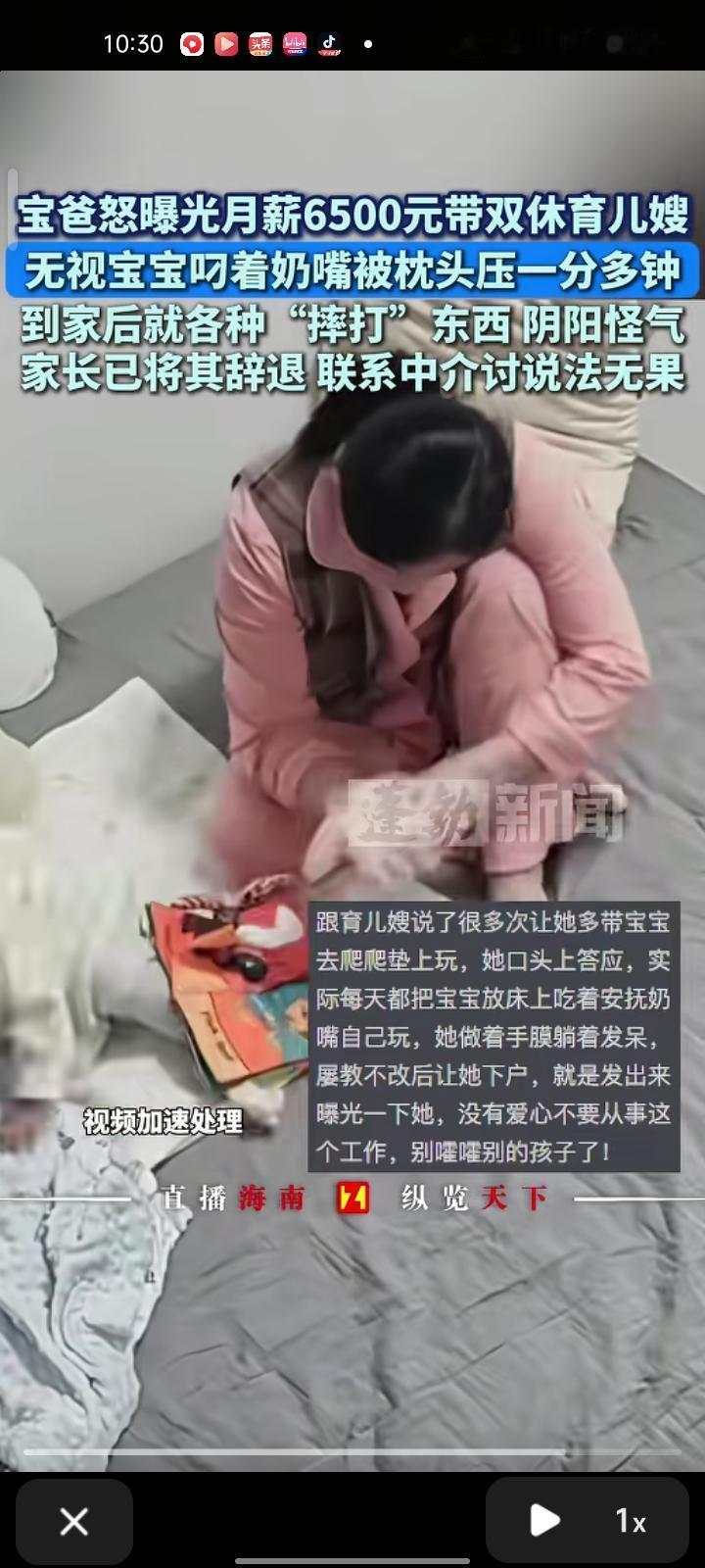 11月18日,河北保定。孩子爸爸晒出监控视频,自己通过中介公司请一位育儿嫂,每月6500带双休,却发现她无故摔东西,说话阴阳怪气。查了监控画面,事情发生在10月23日,宝宝含着安抚奶嘴被枕头压住,育儿嫂在那边不管不顾。孩子爸爸认为,育儿嫂态度不端正却没有爱心,于是工作了13个工作日后将她辞退,并支付期间工资3980元。针对育儿嫂的行为,他联系中介机构却遭到敷衍。 育儿嫂专业性再强没有爱心和责任心,也不适合照顾孩子,但在现实中,面试时很难在短时间内判断一个人的人品。这一问题不仅仅是“服务质量差”,而是涉及到育儿嫂的责任心和基本职业道德,要是发现晚一点,宝宝可能生命垂危了。