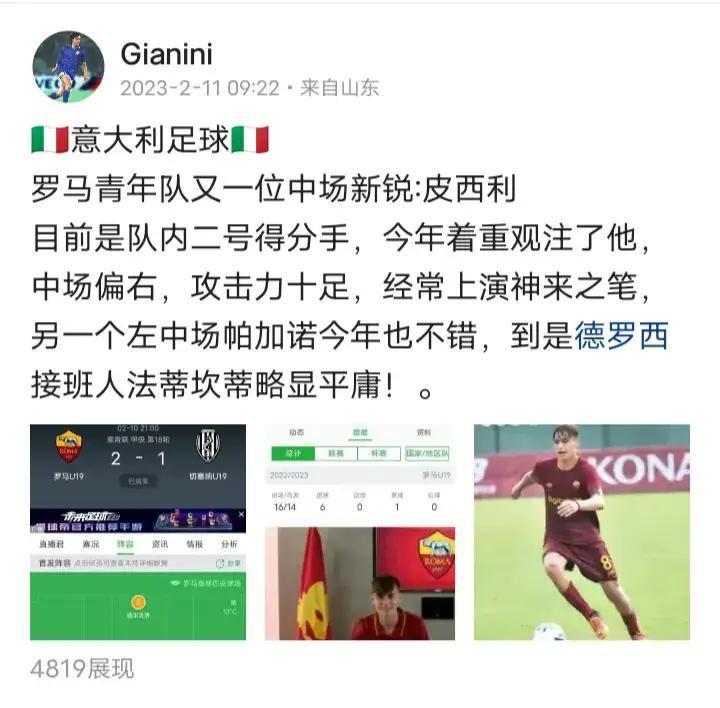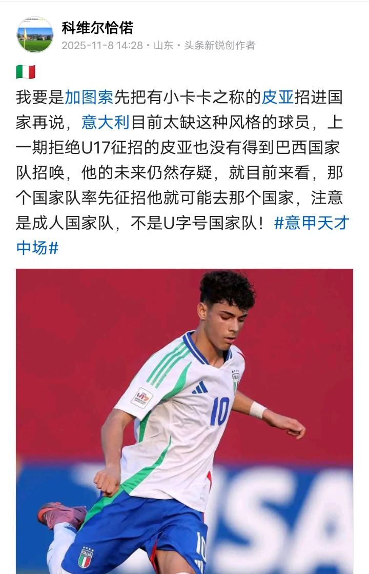 🇮🇹 意大利队惨败挪威后,意大利媒体强烈呼吁加图索要给国家队注入新鲜血液,增加球队的活力和竞争。 我一直也认为既然可以破格提拔皮奥为什么不在其他位置也提拔年轻球员,尤其是右路,感觉这么些年迪洛伦佐只要能动弹主力就是他,但每次都被打的最惨的就是右侧,国家队完全可以招入帕莱斯特拉和卡约德两位新人,另外中场也感觉死气沉沉没有活力,巴雷拉和弗拉泰西感觉一点精气神都没有,罗马的皮西利在国青队状态相当火爆,而且打的也是中路偏右的位置,还有最特别的一个,在U17世界杯上大杀四方的皮亚,皮亚在本次赛事中可以说是一个人在杠着意大利前进,有点像94年世界杯上的巴乔,技术风格正是意大利最缺的9号半,破格提拔他一是提前锁定,免得巴西还在窥探,另一个也许真的会给意大利带来惊喜。