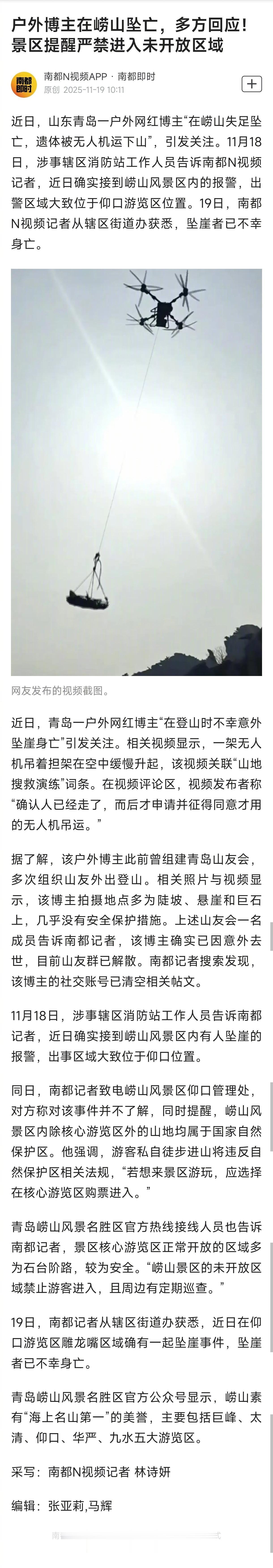 户外博主坠亡遗体被无人机运下山,人类要敬畏大自然,不安全的地方别随意进入。此事件