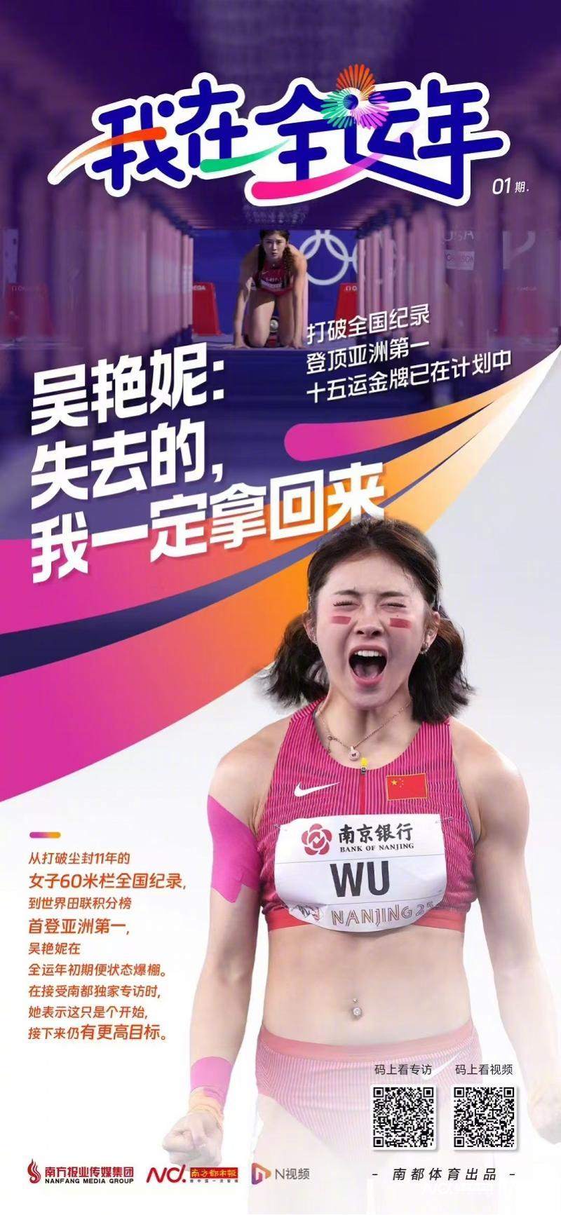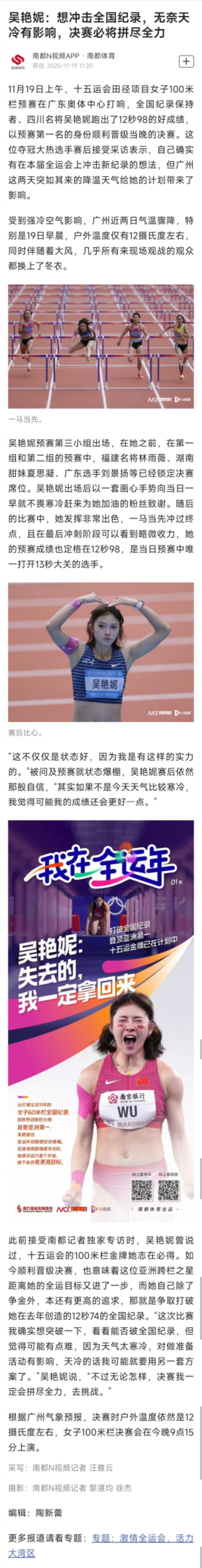 【吴艳妮:想冲击全国纪录,无奈天冷有影响,决赛必将拼尽全力】11月19日上午,十五运会田径项目女子100米栏预赛在广东奥体中心打响,全国纪录保持者、四川名将吴艳妮跑出了12秒98的好成绩,以预赛第一名的身份顺利晋级当晚的决赛。这位夺冠大热选手赛后接受采访表示,自己确实有在本届全运会上冲击新纪录的想法,但广州这两天突如其来的降温天气给她的计划带来了影响。受到强冷空气影响,广州近两日气温骤降,特别是19日早晨,户外温度仅有12摄氏度左右,同时伴随着大风,几乎所有来现场观战的观众都换上了冬衣。吴艳妮预赛第三小组出场,在她之前,在第一组和第二组的预赛中,福建名将林雨薇、湖南甜妹夏思凝、广东选手刘景扬等已经锁定决赛席位。吴艳妮出场后以一套画心手势向当日一早就不畏寒冷赶来为她加油的粉丝致谢。随后的比赛中,她发挥非常出色,一马当先冲过终点,且在最后冲刺阶段可以看到略微收力,她的预赛成绩也定格在12秒98,是当日预赛中唯一打开13秒大关的选手。“这不仅仅是状态好,因为我是有这样的实力的。”被问及预赛就状态爆棚,吴艳妮赛后依然那般自信,“其实如果不是今天天气比较寒冷,我觉得可能我的成绩还会更好一点。”