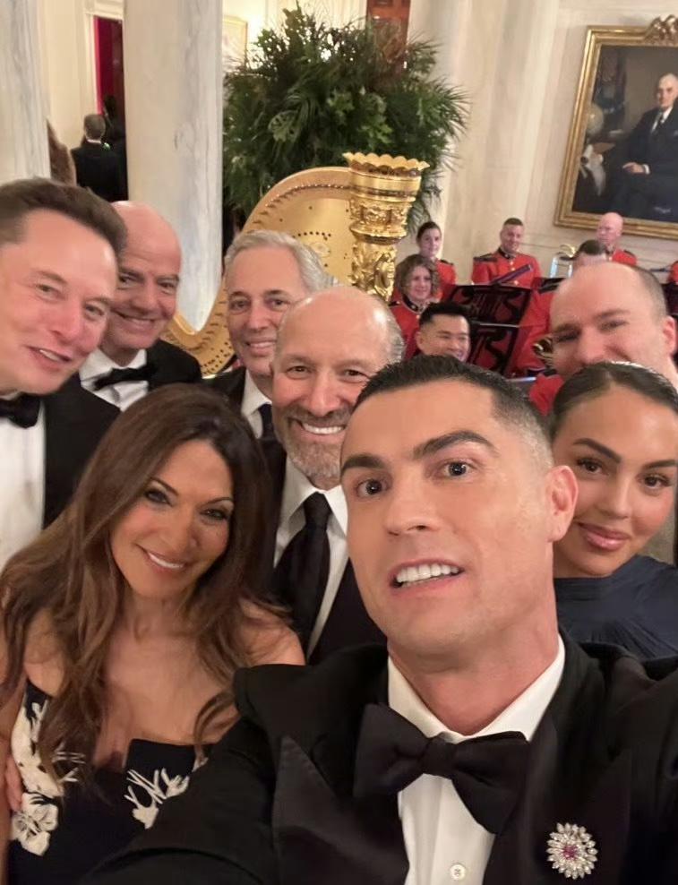 C罗(Cristiano Ronaldo)与妻子乔治娜·罗德里格斯(Georgina Rodríguez)受邀出席今晚在白宫为欢迎沙特王储到访举行的盛大晚宴,并与埃隆·马斯克(Elon Musk)等人合影。