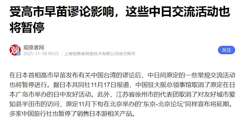 中方宣布延期后,日方承认“这是远超钓鱼岛问题的强烈信号”。中方宣布原定于11月22日至24日在北京举办的“北京-东京”论坛延期举行,论坛日方参与方“言论NPO”17日召开记者会表示,此次延期是高市早苗涉台问题相关言论导致。 “北京-东京”论坛可不是随便搭的草台班子,从2005年创办以来每年雷打不动都在举办。即便是疫情的那几年也没停过,要么线上要么线下还是举办了,也让这个论坛成为了中日间规模最大、层次最高的公共外交平台。 这里聚集了400多位政商学媒各界代表,讨论的内容小到民生关切大到地区和平都能聊,连两国高层领导都常为论坛致辞,说是中日关系的“晴雨表”都不为过。而这么个撑场面的平台,说延期就延期,本身就透露了我们对高市早苗此次不当言论的严重不满。 作为日本首相,高市早苗11月7日在国会直接宣称“台湾有事”若伴随武力就可能构成日本“存亡危机事态”,这话翻译过来就是暗示要军事介入台海。更别提她4月还窜访台湾鼓吹“安全合作”,摆明了是揣着明白装糊涂,硬往我方的红线上撞。 我方的反应从来不是只动嘴皮子,11月13日外交部副部长就召见日方官员,隔天驻日大使又“奉示”约见,用的都是最高级别的交涉措辞。 紧接着就亮出实招:旅游、教育部门接连发提醒,旅行社停了赴日业务,航空公司开放免费退改签,连本就该办的广岛友好活动也直接取消,“北京-东京”论坛的延期不过是其中一环。 这一套组合拳下来,日本市场立马有了反应。东京股市旅游、航空板块集体下跌,野村综合研究所算过账,单是中国游客减少这一项,未来一年日本经济就得损失2.2万亿日元,GDP要掉近0.36%,本就低增长的日本经济哪经得住这么折腾。 日方说这信号“远超钓鱼岛问题”,可见其心里门儿清此次事件有多么的严重。 台湾问题是中国核心利益中的核心,是涉及国家主权完整的红线,《开罗宣言》、《波茨坦公告》早把台湾归还中国,这是战后国际秩序的根基,高市的言论不仅碰了中方底线,更是在挑战历史正义。 而我们就是要通过这种方式告诉日方:交流的前提是尊重底线,不是让你拿着敏感问题当筹码。 这论坛毕竟是“以民促官”的重要渠道,平时能聊合作、释分歧,可要是有人非要往红线里跳,那这沟通的桥梁自然得先收一收。 延期论坛不是小气,是给日方划清边界——涉台问题没有商量的余地!