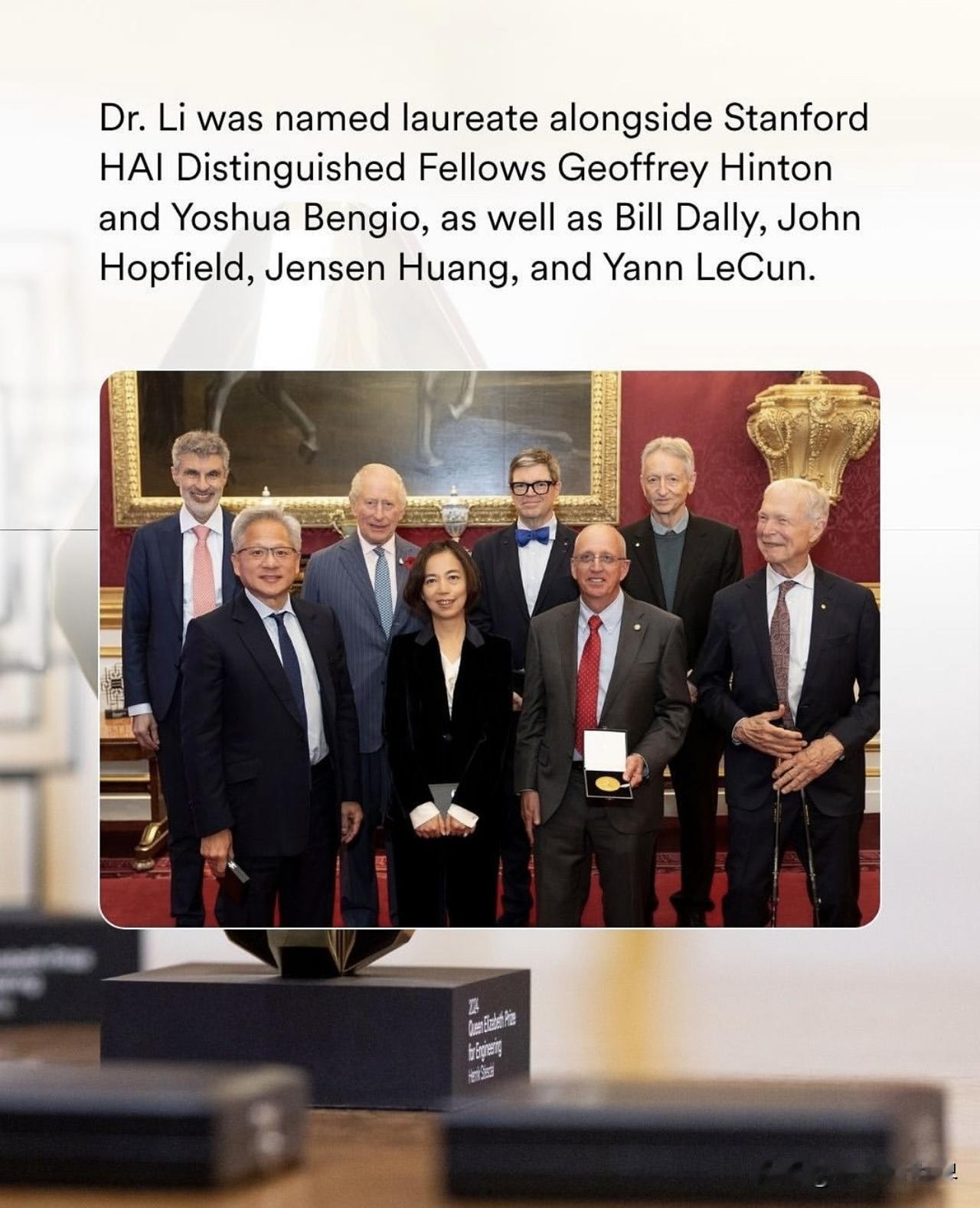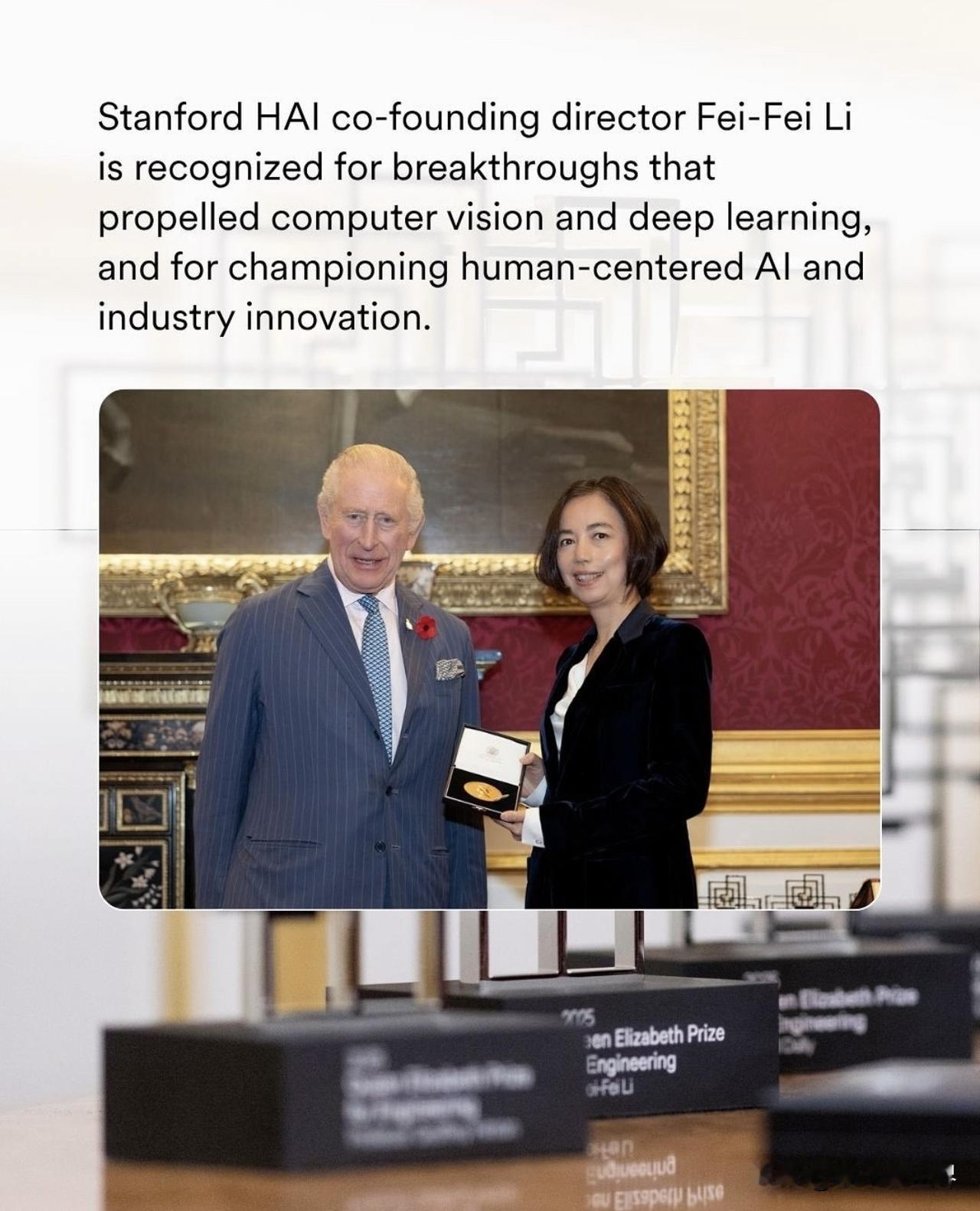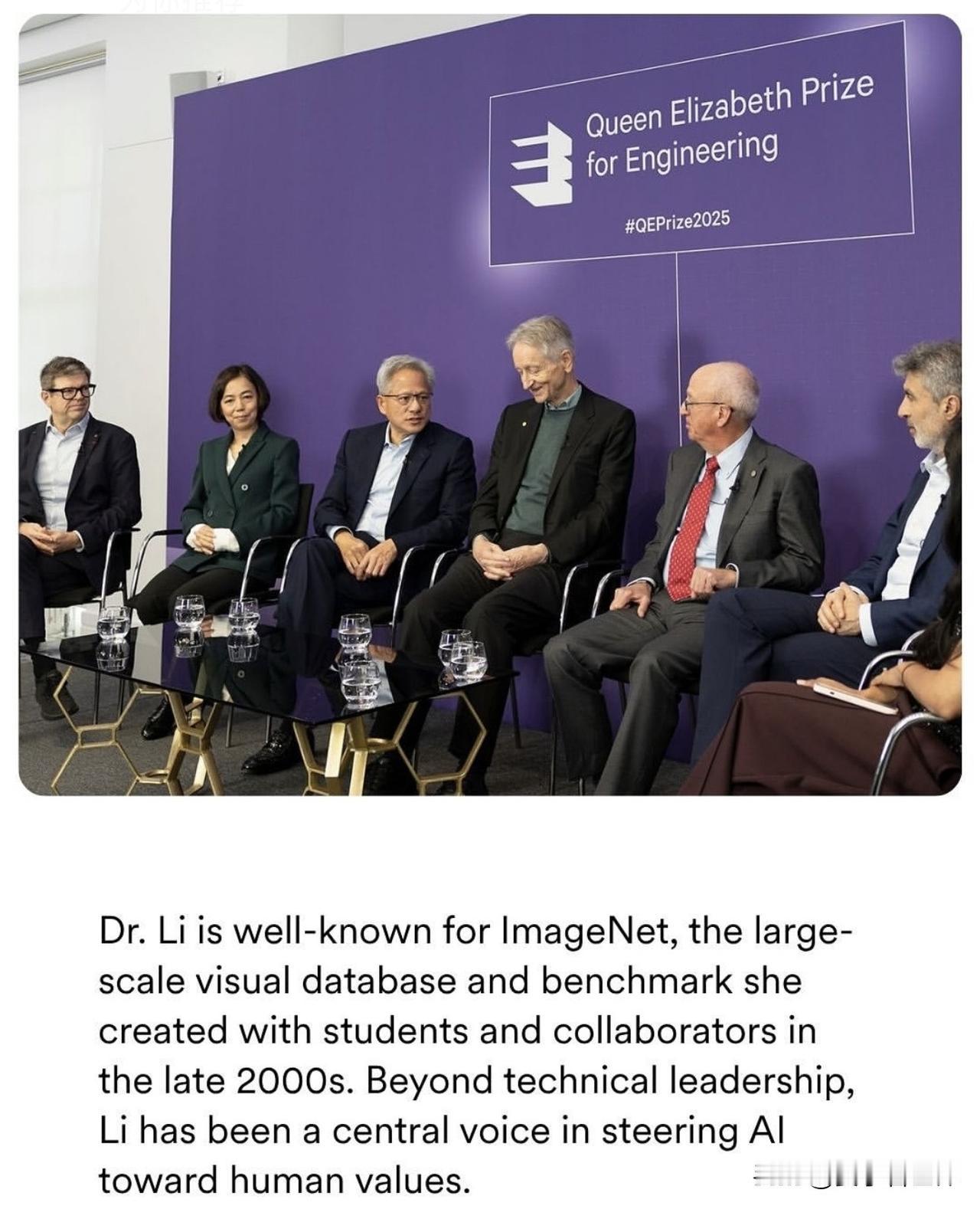 “AI教母”李飞飞与美国斯坦福大学杰出研究员 Geoffrey Hinton和 Yoshua Bengio以及获奖者Bill Dally, John Hopfield, Jensen Huang和 Yann LeCun一起获得了 2025年“伊丽莎白女王工程奖”。
