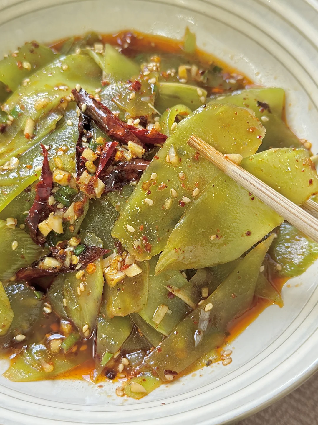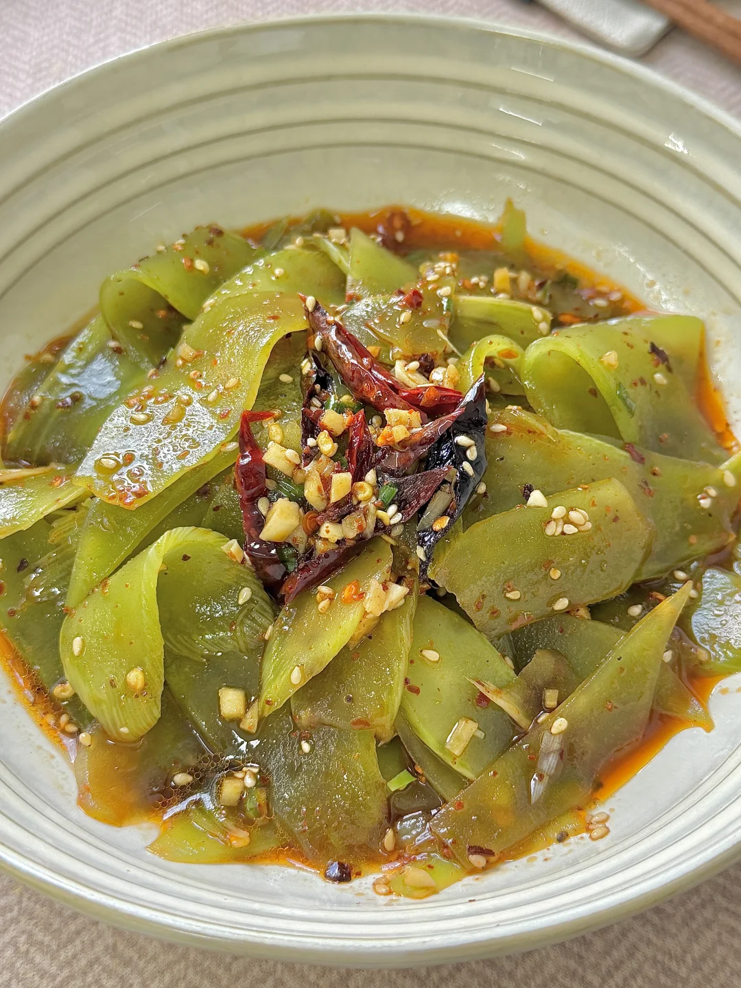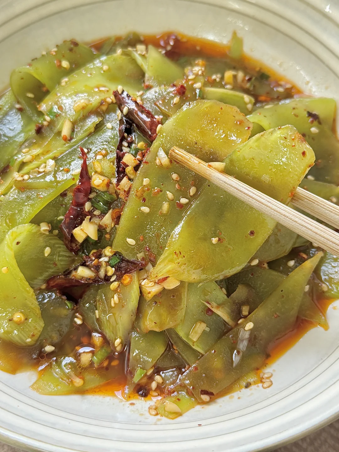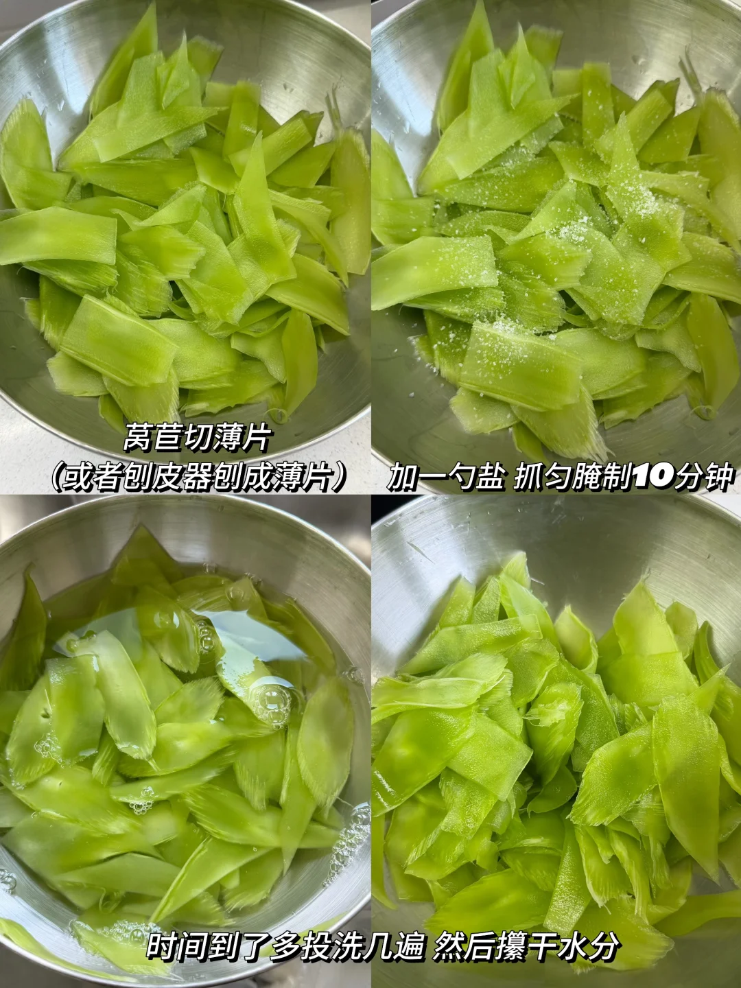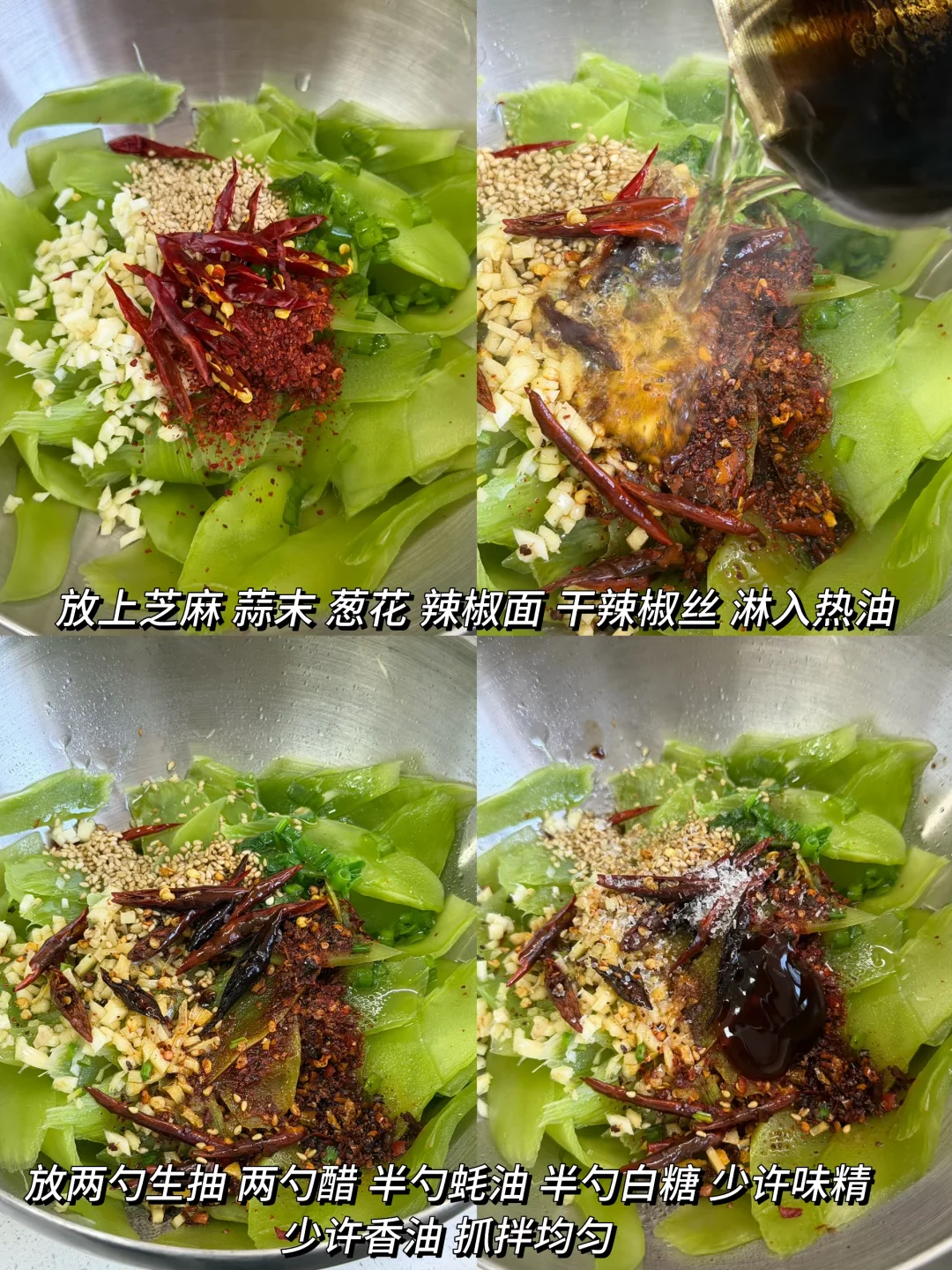 附做法: 1️⃣莴苣切薄片(或者用刨皮到刨成薄片),放一勺盐抓拌均匀,腌制10分钟 2️⃣腌完多投洗几遍,然后攥干水分,放上芝麻、蒜末、葱花、辣椒面、干辣椒丝,淋上热油 3️⃣加两勺生抽、两勺醋、半勺蚝油、半勺白糖、少许味精、少许香油,抓拌均匀✅ -