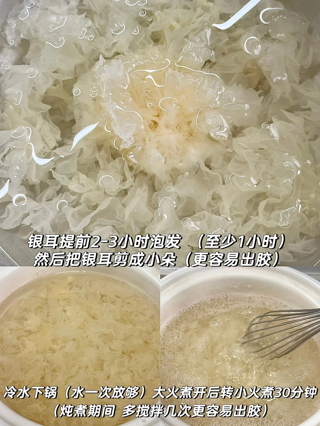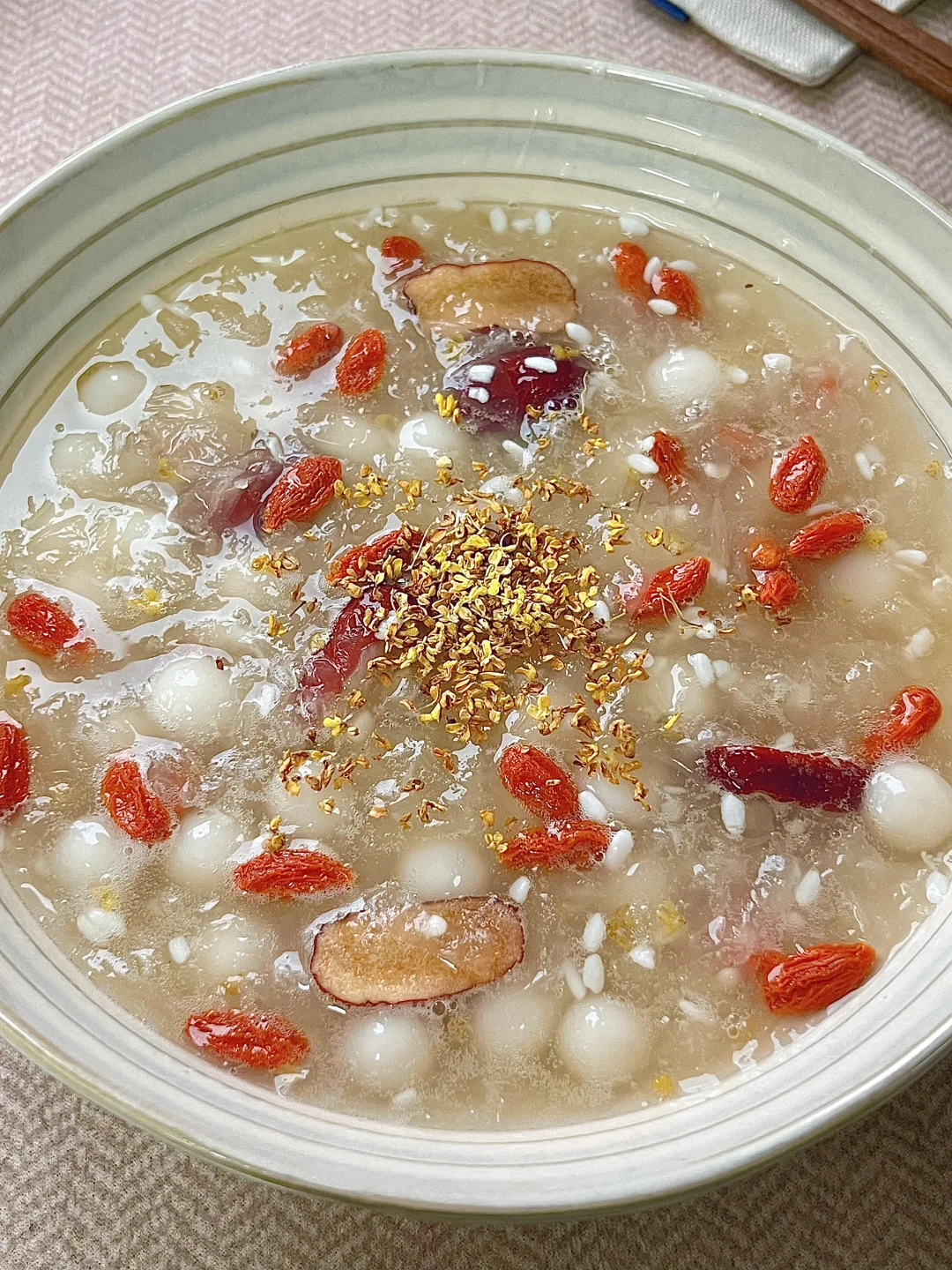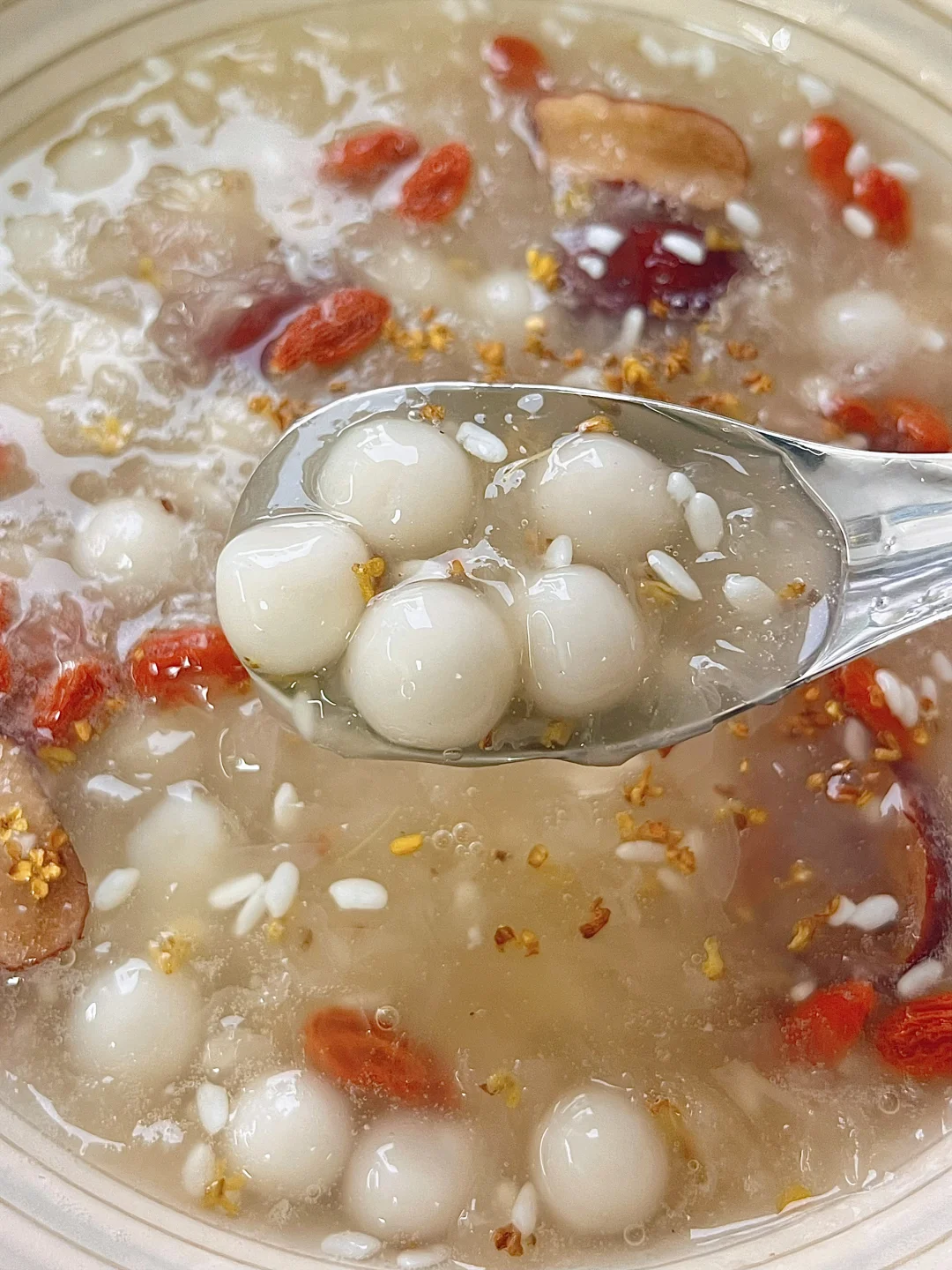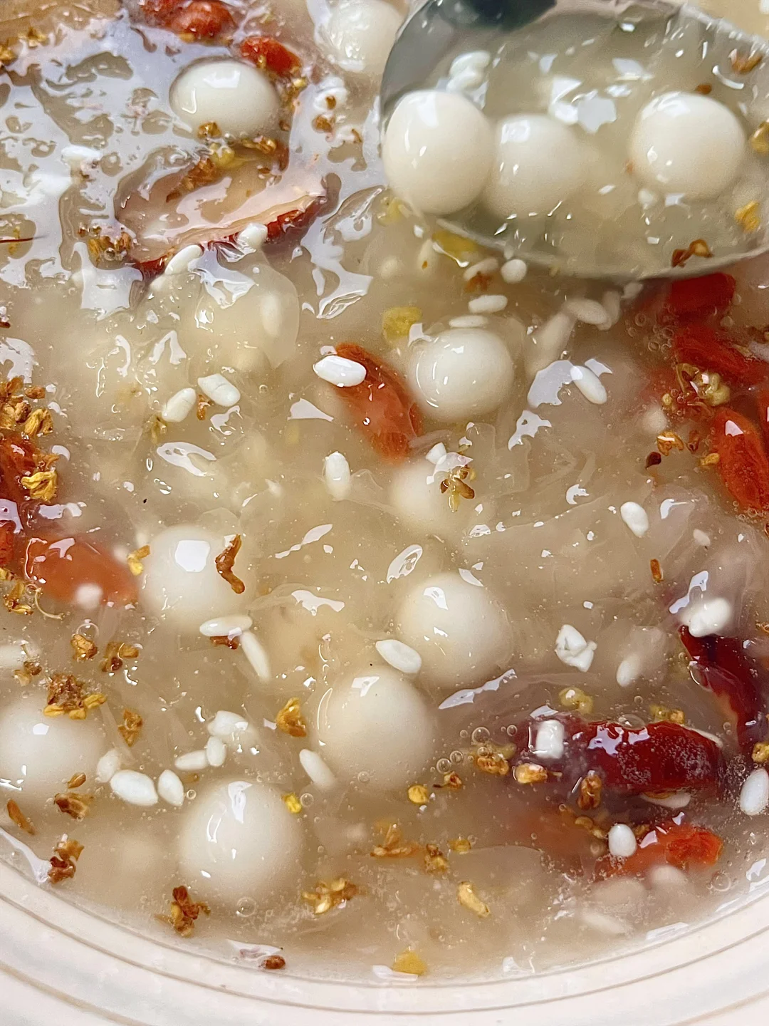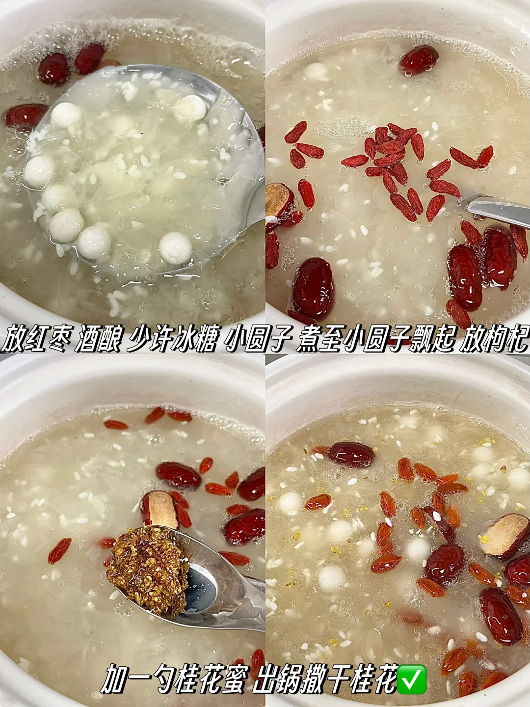 附做法: 1️⃣银耳提前2-3小时泡发(至少一小时),然后剪成小朵(更容易出胶),大火煮开后转小火煮30分钟(期间搅动几次更容易出胶) 2️⃣放红枣、酒酿、少许冰糖、小圆子,小圆子煮熟飘起来后,放枸杞,再放一勺桂花蜜,撒干桂花出锅✅ -