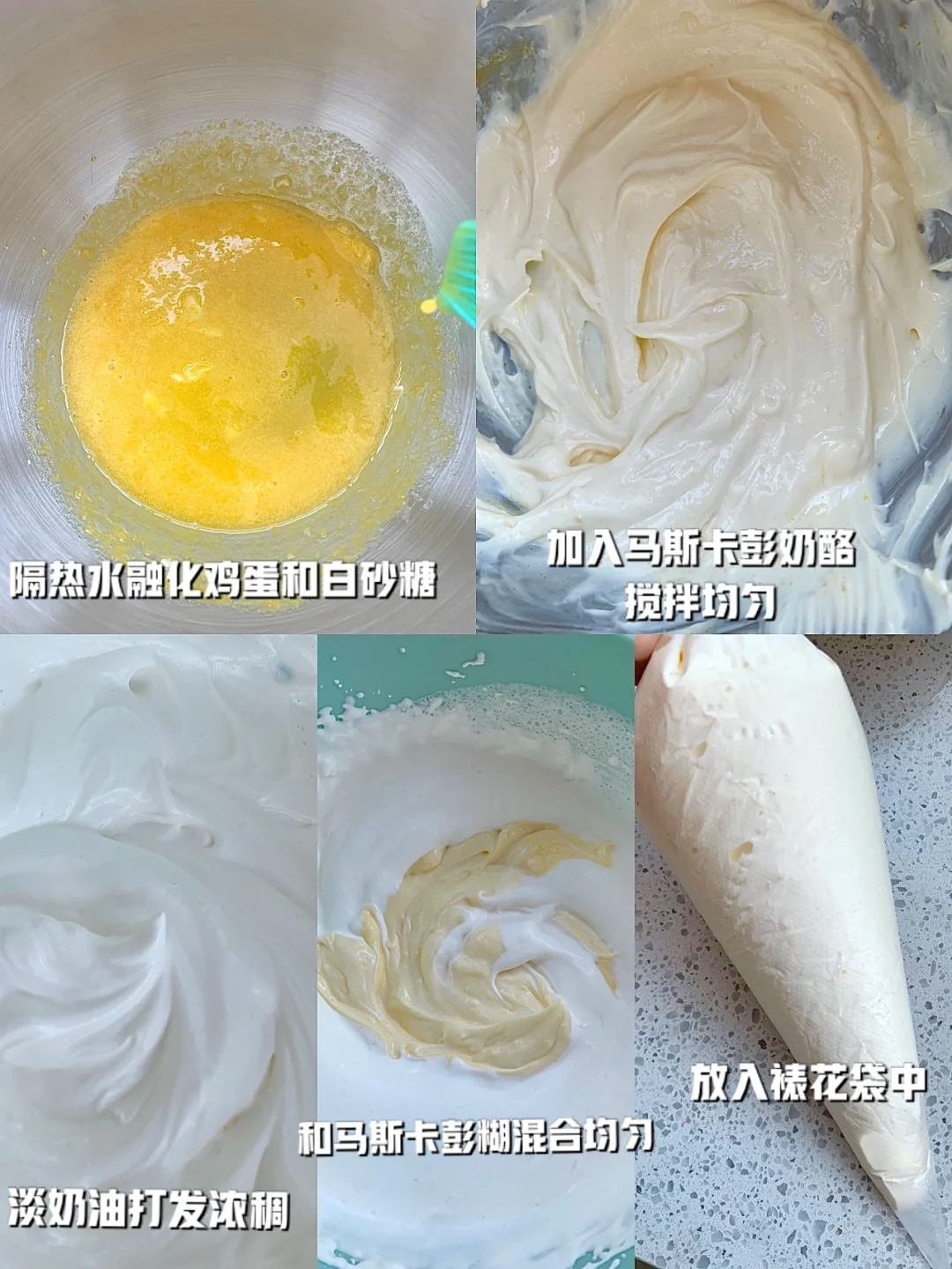 2⃣️淡奶油打发至浓稠,拌入马斯卡彭奶酪糊,装进裱花袋