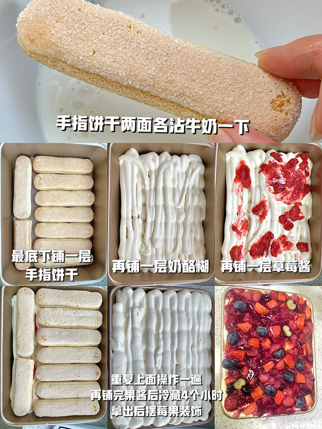 3⃣️手指饼干两面各沾一下牛奶,铺在模具最底面,再铺一层奶酪糊,再铺一层草莓酱,重复一次操作