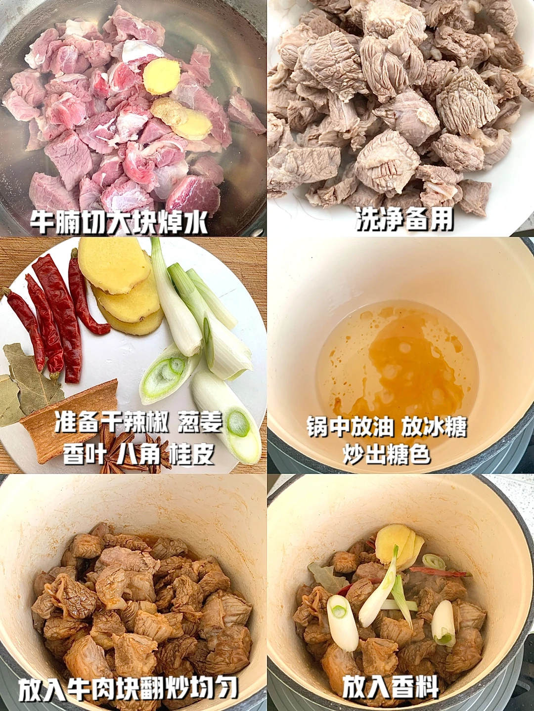 1⃣️牛腩切大块,焯水洗净备用,锅中放油,放入冰糖炒出糖色,放入牛腩翻炒均匀