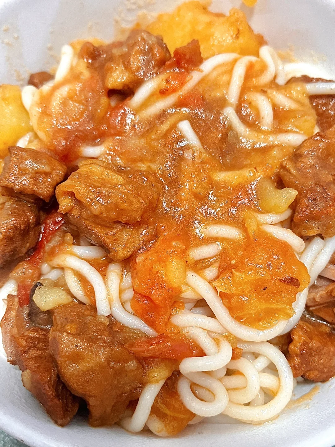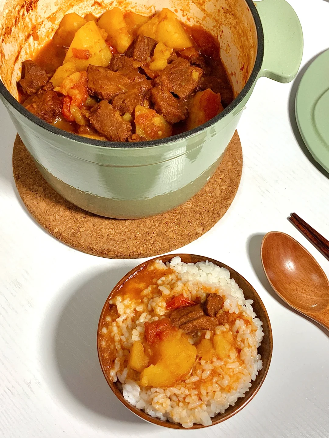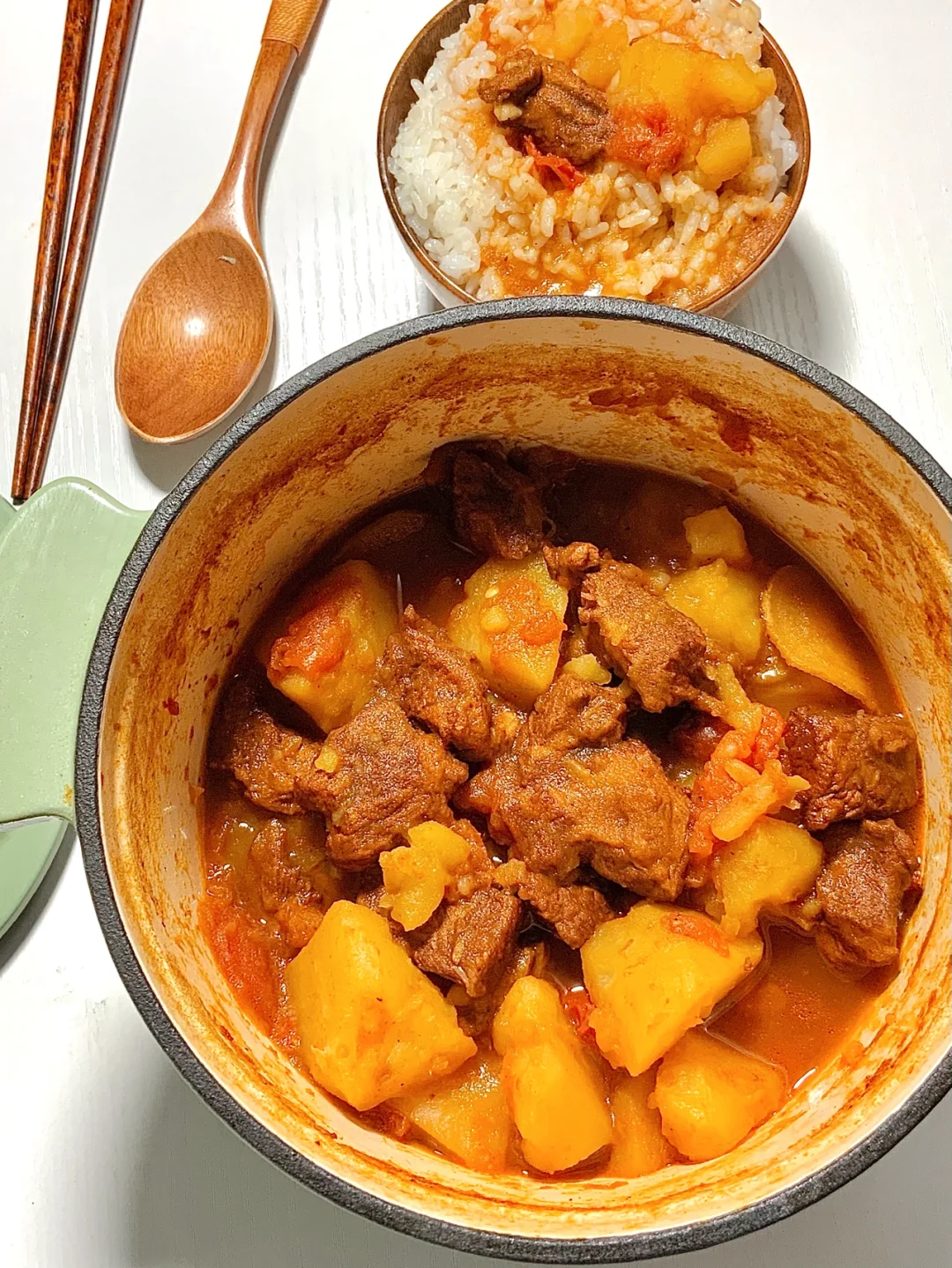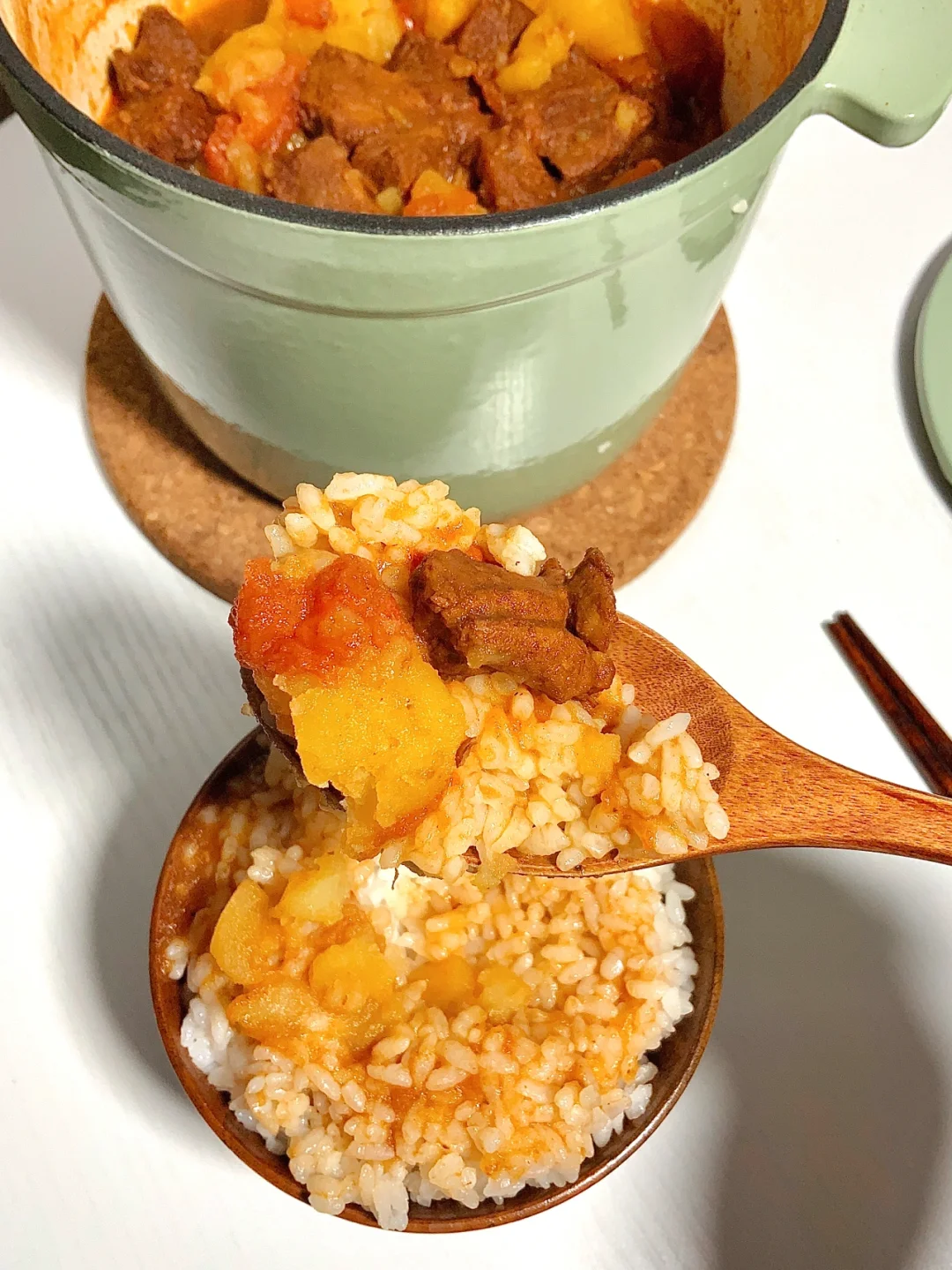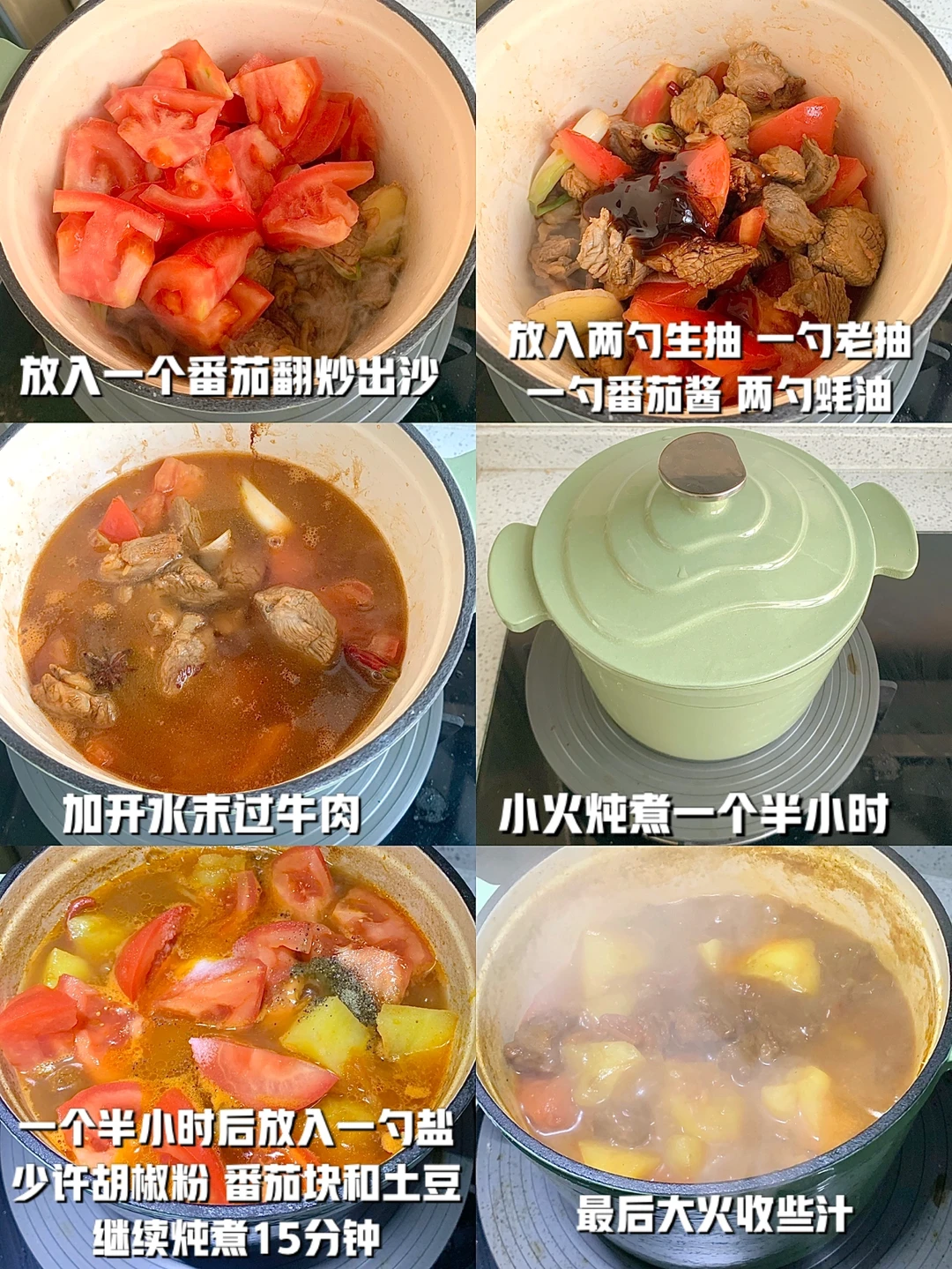4⃣️一个半小时后放入土豆和一个番茄块,加一勺盐、少许胡椒粉,继续焖煮15分钟,最后大火收些汁✅