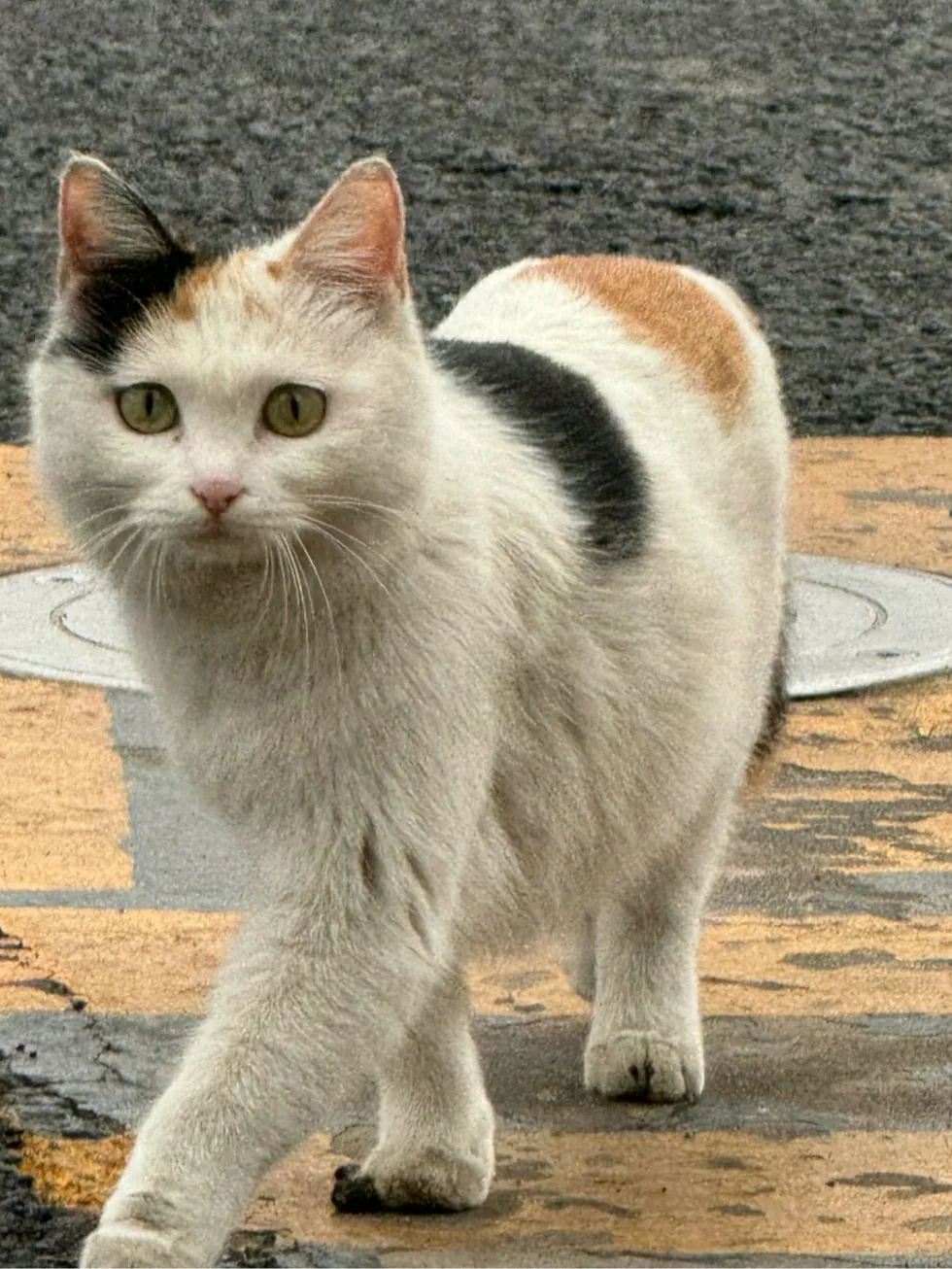 路边偶遇三花猫,不知道有没有家。看似象流浪猫!