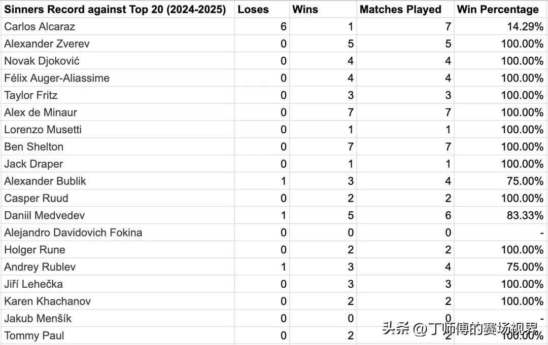 世界排名前20的高手在2024–2025赛季对阵辛纳的战绩: 卡洛斯·阿尔卡拉斯:6胜1负(胜率85.71%) 亚历山大·兹维列夫:5战全败(胜率0%) 诺瓦克·德约科维奇:4战全败(胜率0%) 费利克斯·奥热-阿利亚西姆:4战全败(胜率0%) 泰勒·弗里茨:3战全败(胜率0%) 阿列克斯·德米纳尔:7战全败(胜率0%) 洛伦佐·穆塞蒂:1战全败(胜率0%) 本·谢尔顿:7战全败(胜率0%) 杰克·德雷珀:1战全败(胜率0%) 亚历山大·布勃利克:1胜3负(胜率25%) 卡斯珀·鲁德:2战全败(胜率0%) 丹尼尔·梅德韦杰夫:1胜5负(胜率16.67%) 亚历杭德罗·达维多维奇·福基纳:未交手 霍尔格·鲁内:2战全败(胜率0%) 安德烈·卢布列夫:1胜3负(胜率25%) 伊日·莱赫卡:3战全败(胜率0%) 卡伦·卡恰诺夫:2战全败(胜率0%) 雅库布·门希克:未交手 汤米·保罗:2战全败(胜率0%) 有一说一,辛纳是当今男子网坛最难被打败的球手,除了对阿尔卡拉斯处于下风,几乎能够横扫其他人,强如德约科维奇都难求一胜,毫不夸张的说,辛纳就是当年的费德勒,大家觉得呢?