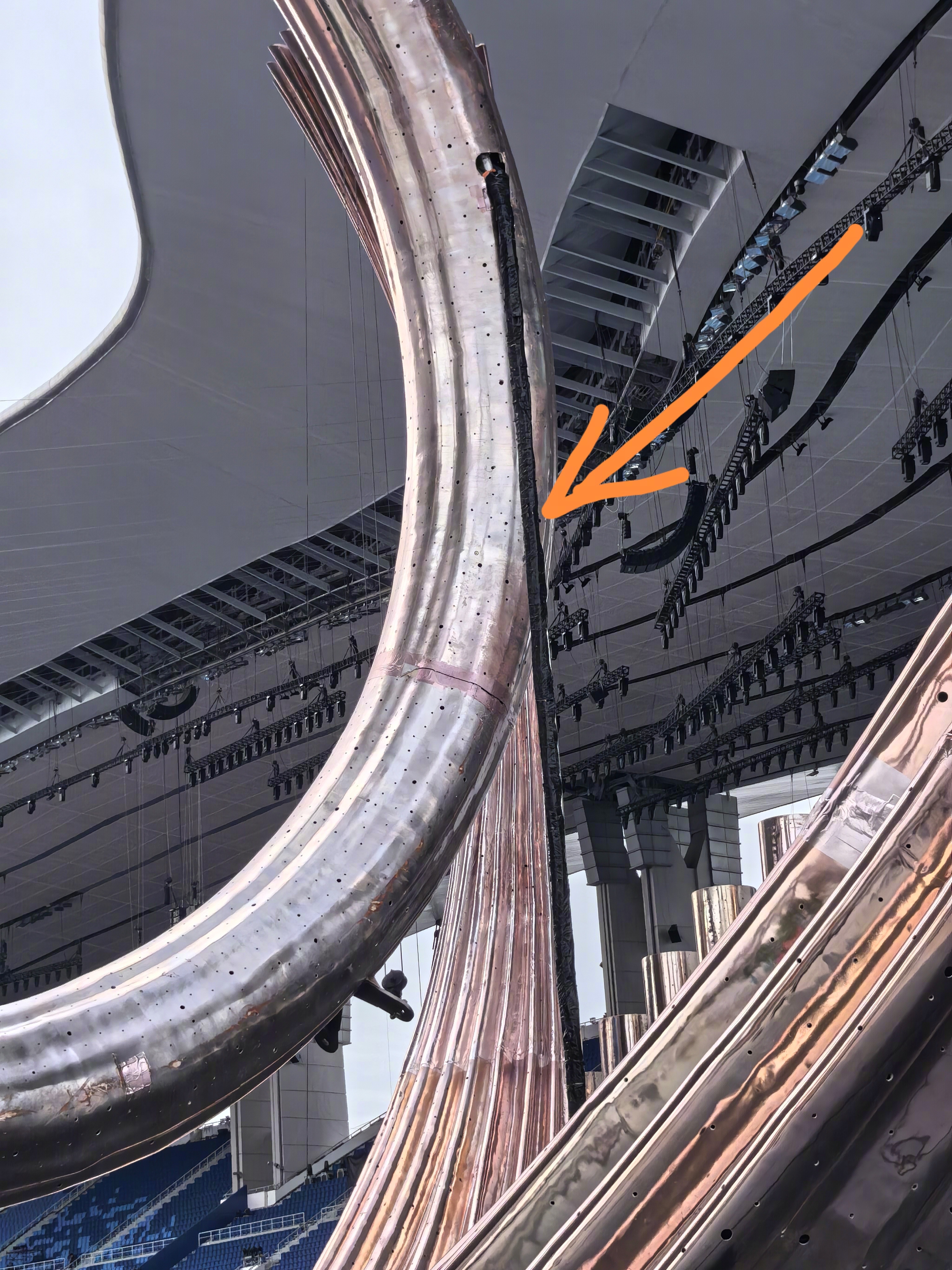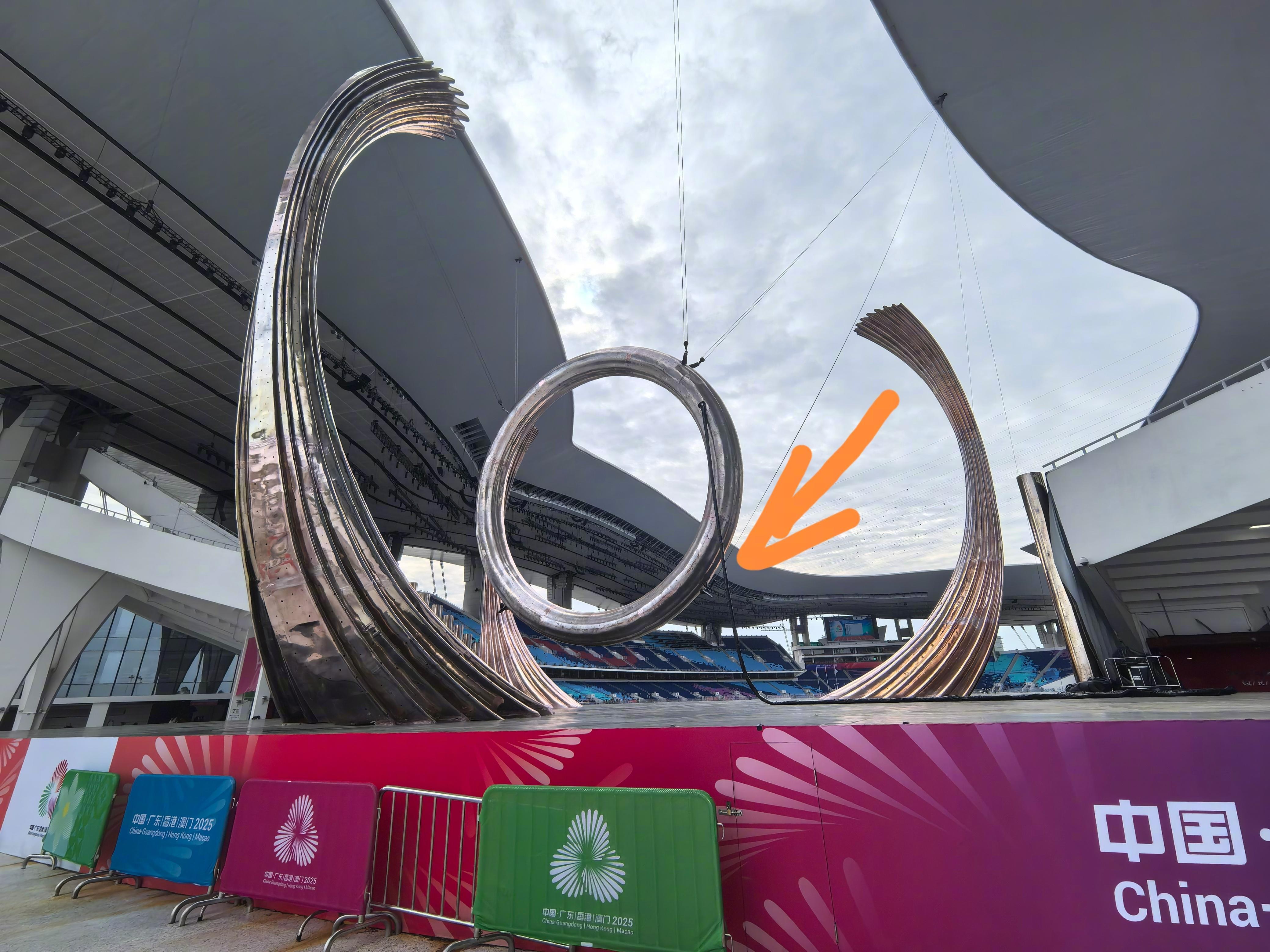 不懂就问,这是全运会的圆环大火炬,点燃后整个圆圈都冒火,细看密密麻麻地有火孔。问题来了,请看图2和图3的箭头所指处,黑色粗管子应该是天然气管,大火炬整圈冒火后,不会把天然气管子烧坏吗?
