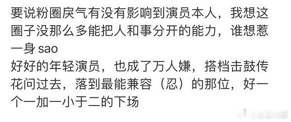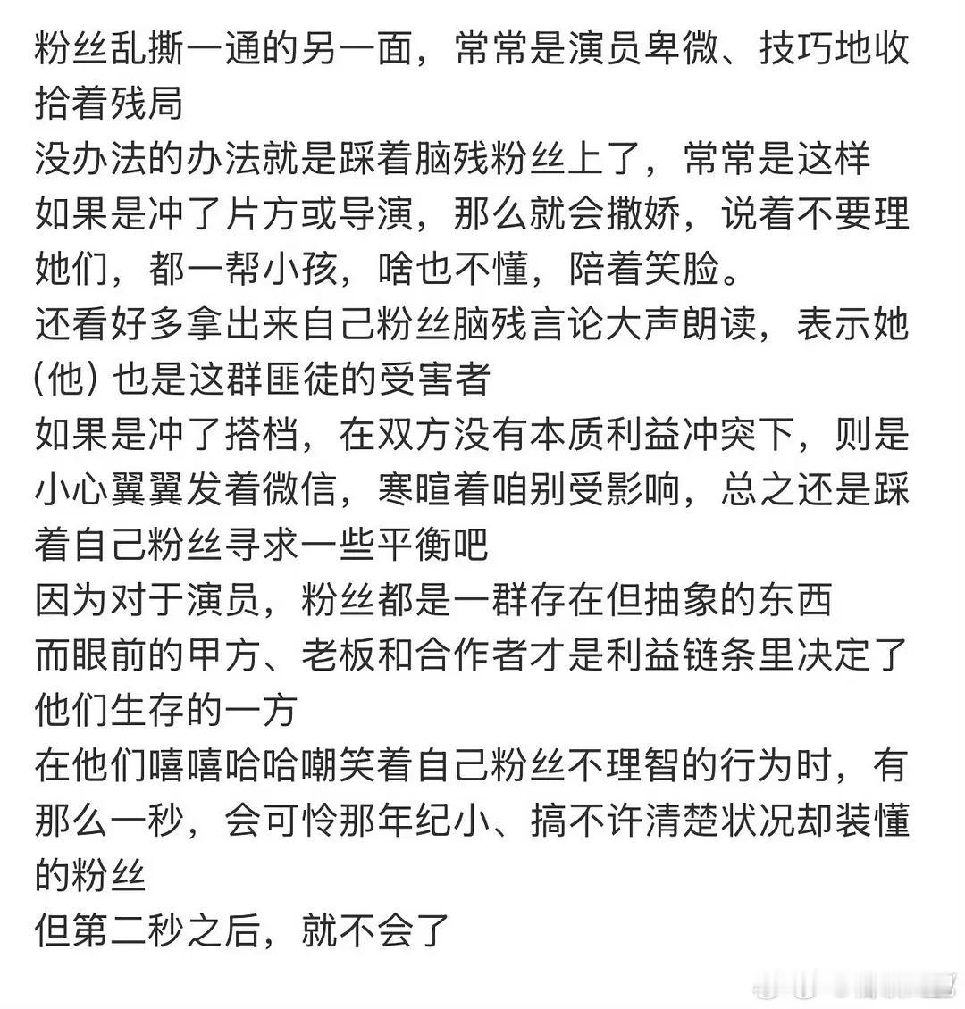 业内:粉丝乱撕一通的另一面,常常是演员卑微、技巧地收拾着残局。好好的年轻演员,也成了万人嫌,搭档击鼓传花问过去,落到最能兼容(忍)的那位,好一个一加一小于二的下场。