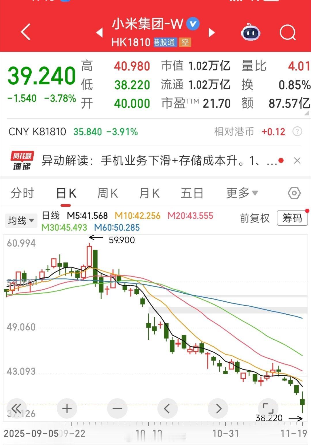 昨天小米公布2025年三季度核心数据:营收:1131.2亿元(+22.3%)净利润:113.1亿元(+80.9%)手机×AIoT:收入841.1亿元,占比74.4%。汽车等新业务:收入激增199.2%至290.1亿元,占比25.6%。真是看不懂了,小米这季报业绩这么好,利润都快翻倍了,汽车业务也起来了,结果股价还在跌,今天都跌破40块了。从高点下来,30个点就这么没了。这到底是业绩不及预期,还是市场情绪太差,这走势确实太弱了。