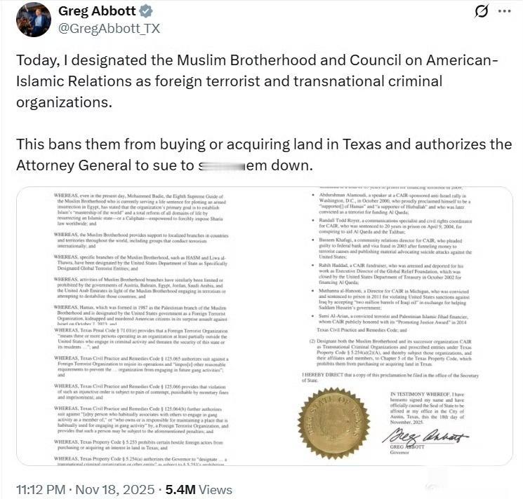 美德州州长阿博特: 今天,我将“穆斯林兄弟会”和“美国伊斯兰关系委员会”指定为外国恐布组织和跨国犯罪组织。 这将禁止他们在德克萨斯州购买或获取土地,并授权司法部长提起诉讼以关闭他们的组织。