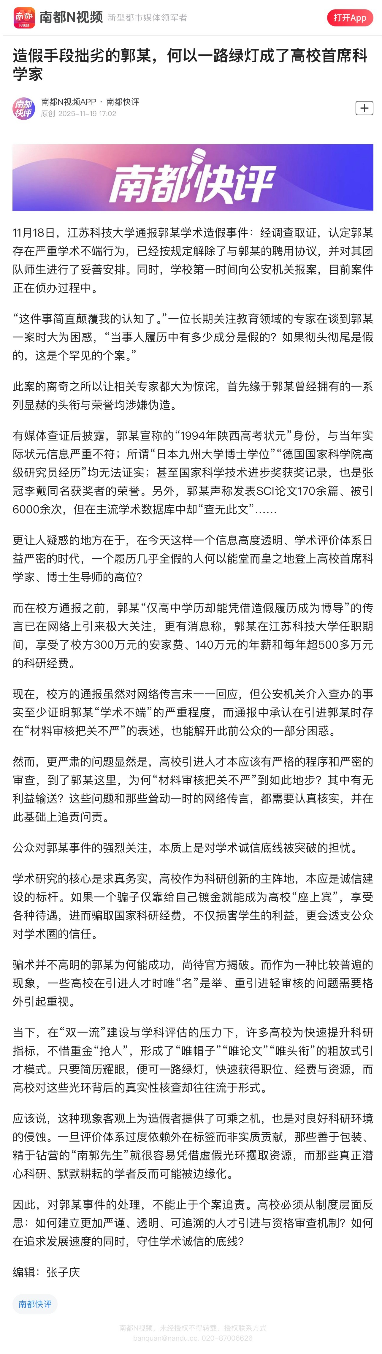 【南都快评:造假手段拙劣的郭某,何以一路绿灯成了高校首席科学家】有媒体查证后披露,郭某宣称的“1994年陕西高考状元”身份,与当年实际状元信息严重不符;所谓“日本九州大学博士学位”“德国国家科学院高级研究员经历”均无法证实;甚至国家科学技术进步奖获奖记录,也是张冠李戴同名获奖者的荣誉。另外,郭某声称发表SCI论文170余篇、被引6000余次,但在主流学术数据库中却“查无此文”……更让人疑惑的地方在于,在今天这样一个信息高度透明、学术评价体系日益严密的时代,一个履历几乎全假的人何以能堂而皇之地登上高校首席科学家、博士生导师的高位?公众对郭某事件的强烈关注,本质上是对学术诚信底线被突破的担忧。当下,在“双一流”建设与学科评估的压力下,许多高校为快速提升科研指标,不惜重金“抢人”,形成了“唯帽子”“唯论文”“唯头衔”的粗放式引才模式。只要简历耀眼,便可一路绿灯,快速获得职位、经费与资源,而高校对这些光环背后的真实性核查却往往流于形式。因此,对郭某事件的处理,不能止于个案追责。高校必须从制度层面反思:如何建立更加严谨、透明、可追溯的人才引进与资格审查机制?如何在追求发展速度的同时,守住学术诚信的底线?