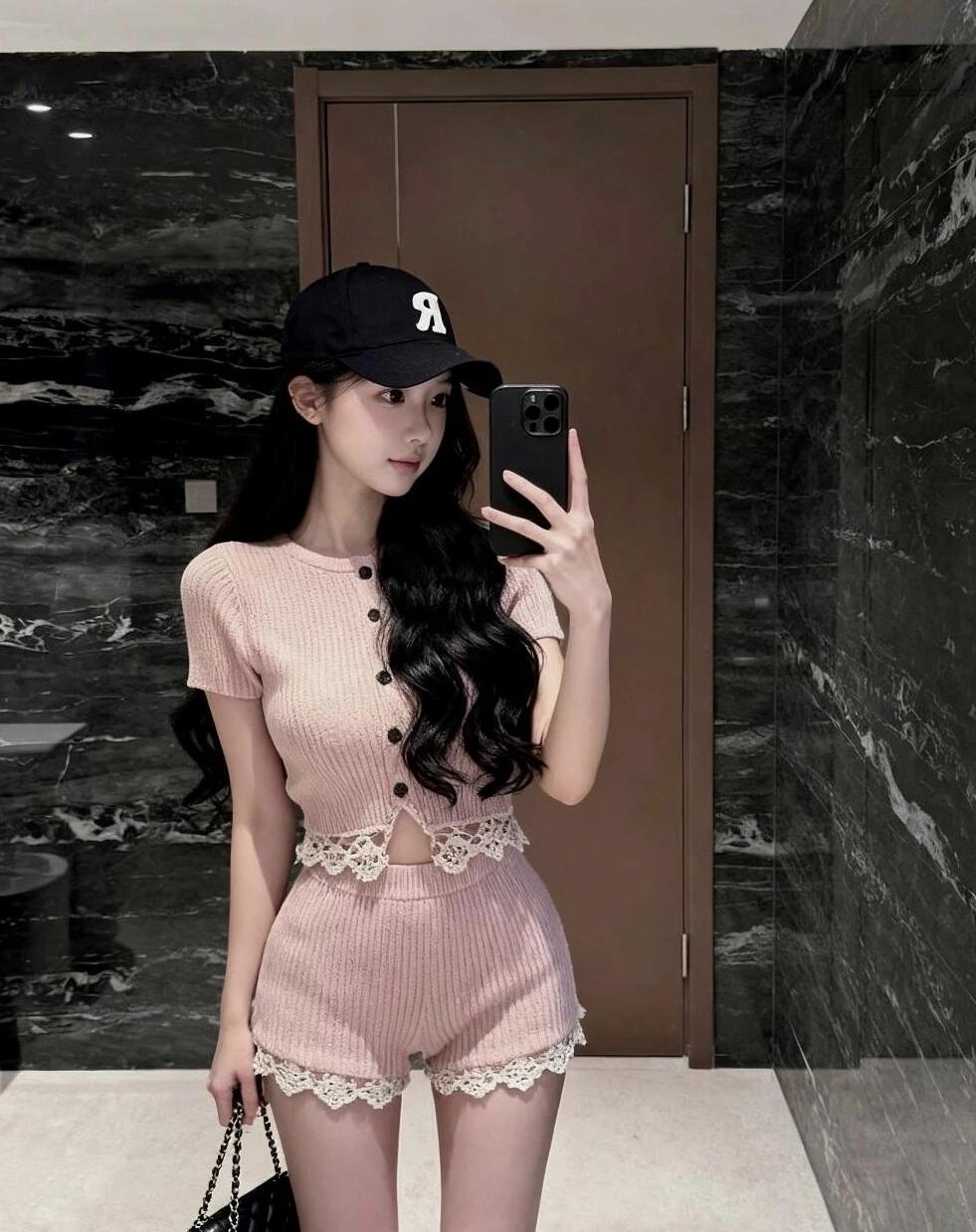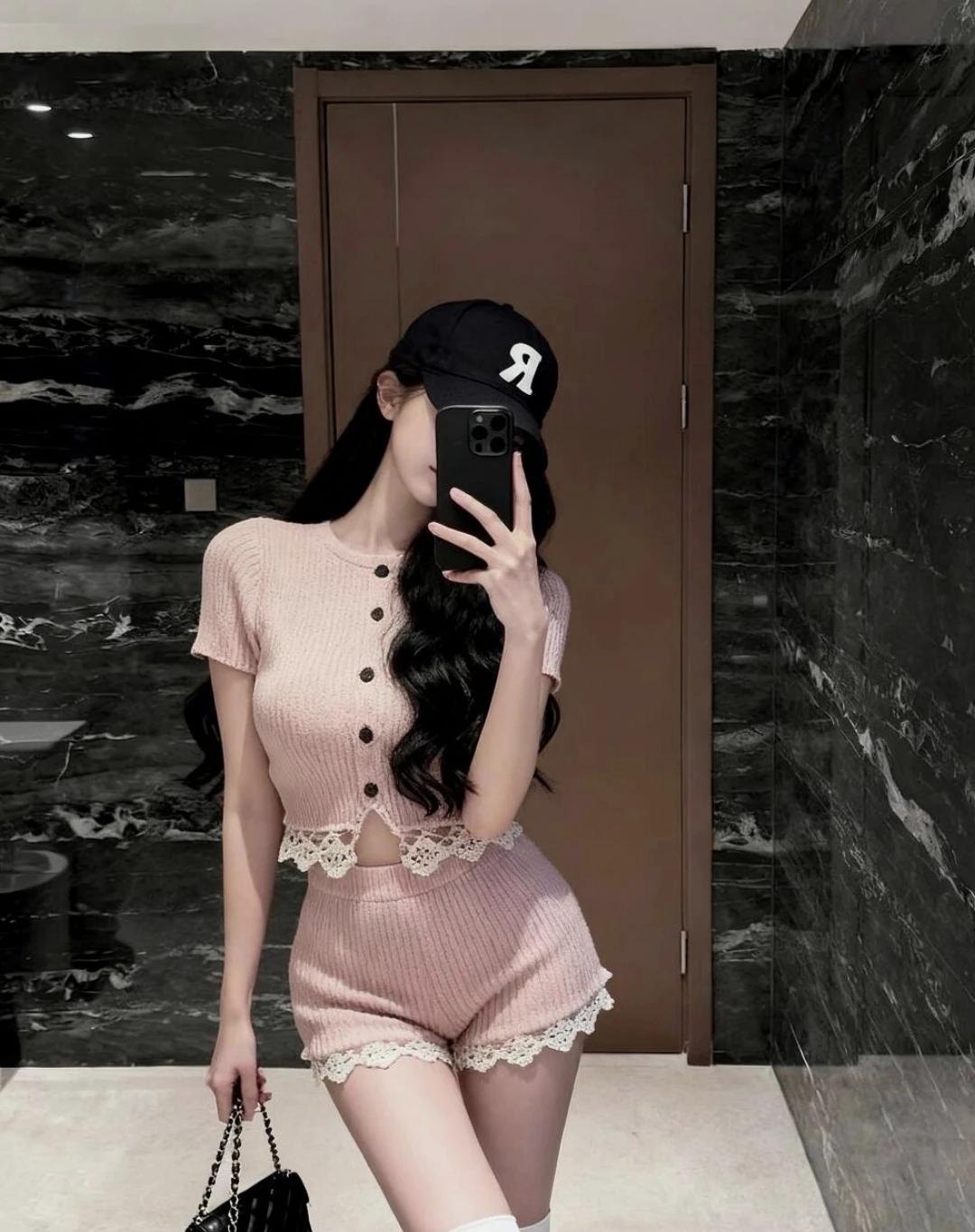 粉糯糯的针织套装自带嗲气buff~蕾丝边边刚好戳中甜妹心巴💘 黑帽+小挎包浅浅中和一下甜腻,随手拍都像韩系女高出街📸