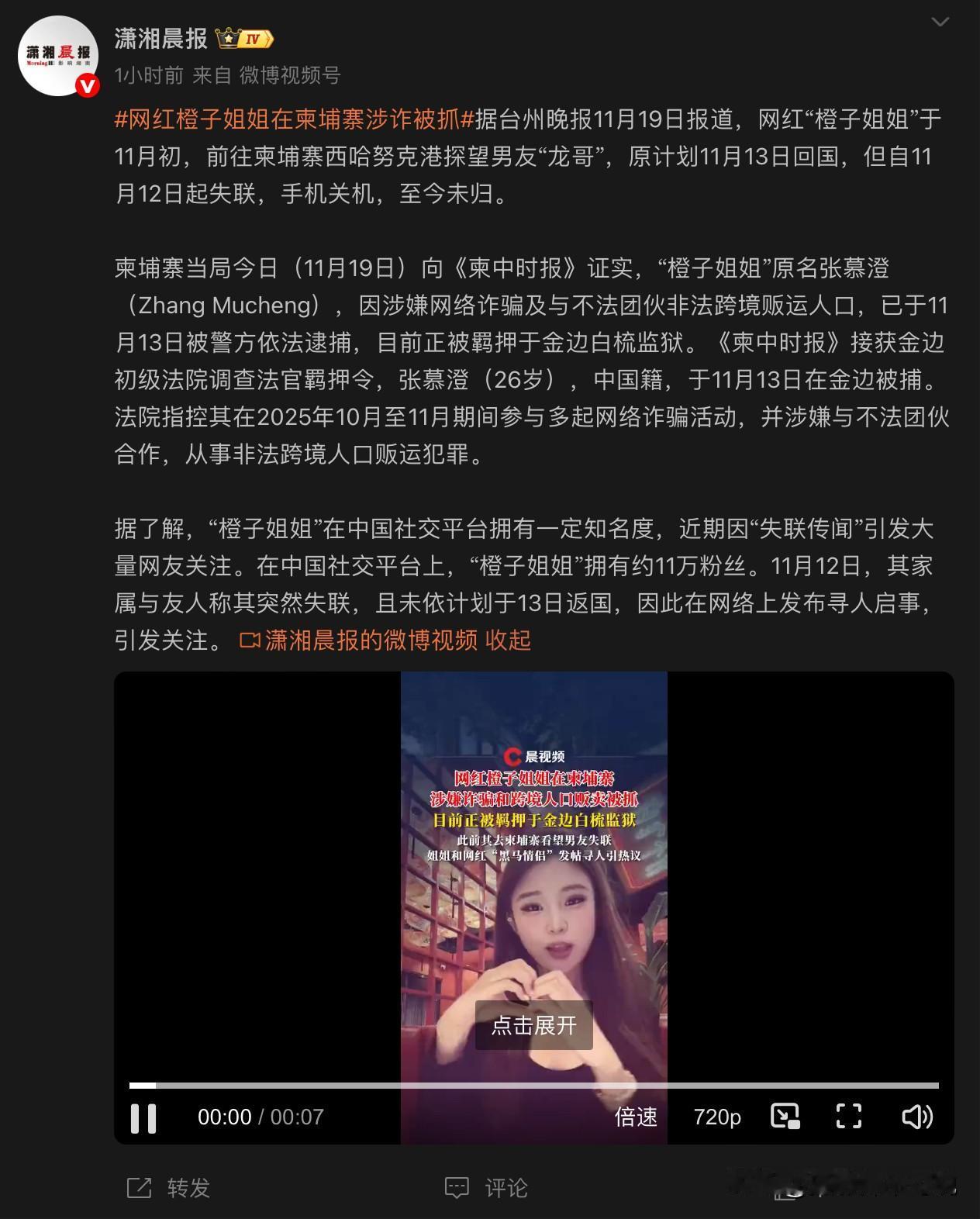 还记得前两天在柬埔寨失踪的网红美女博主吗?没错,就是前两天在网上发布寻人启事寻找的那位。据当时的寻人启事所言,该美女博主是去柬埔寨探望男朋友,原计划本月13号就返回,但却一去不回。当时看了这则寻人启事,就隐隐觉得有点不妙,会不会是被骗去干什么不好的事情了?也是为她捏了一把汗!结果今天新闻报道来了,该美女博主居然是因涉嫌网络诈骗及与不法团伙非法跨境贩运人口,已于11月13日被警方依法逮捕,目前正被羁押于金边白梳监狱。哎,看来情况比我所想想象的还要严重得多。如果今后证实报道属实的话,那她就是咎由自取了,要知道不管是人口贩子或者网诈可都不是什么好名声,如果又是自愿加入,那就应该为自己的所作所为付出代价。