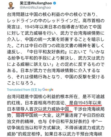 ·给高市早苗定性了!高市早苗的恶劣言论被定性为首次向中国发出武力威胁! 11月19日,我们的驻日大使吴江浩表示,台湾问题是中国核心利益中的核心,红线中的红线。高市首相的言论,是1945年以来日本领导人首次向中国发出武力威胁,暗示日本将武力介入台湾,阻挠中国统一大业。   这番言论的分量非同小可,它直接捅破了中日关系之间一层极其重要的窗户纸,要知道,二战之后,中日两国为了能重新坐下来好好说话,费了很大力气,签署了包括《中日和平友好条约》在内的四个政治文件。   这些文件里写得清清楚楚,双方约定好了要用和平的方式解决问题,绝不动用武力或者拿武力来吓唬对方。   这几十年来,这些约定就像是两国关系航船的压舱石,风浪再大,船也基本稳得住,可高市早苗这么一嚷嚷,等于是在这块压舱石上凿了个窟窿,把两国交往的根本规矩给扔到了一边。   这种行为不仅仅是让邻居不高兴那么简单,它还可能惊动一个沉睡已久的“大家伙”——那就是《联合国宪章》里的“敌国条款”。   这个条款是当年二战结束后,为了摁住德国、日本这些国家,防止它们再惹事生非而专门设立的。   条款说白了就是,如果这些国家有再次侵略的苗头,其他国家可以不用等安理会点头,直接采取行动管教它们。   高市早苗的言论,恰恰就在试探这个条款的底线,这等于是在提醒全世界,日本有人正在挑战整个战后世界秩序的安排。   吴江浩大使特意点出“1945年以来首次”,这不仅仅是在计算时间,更是在提醒日本,不要忘了历史,如果一些日本政客,开始公然撕毁两国之间的和平承诺,动摇双边关系的政治基础,那么后果会是什么?   一个现实的例子就摆在那儿:日本和俄罗斯。就因为二战的和平条约一直没签,从法理上讲,这两个国家到现在都不能算完全结束了战争状态。   高市早苗这种危险的言行,就是在把中日关系往这条死胡同里推,难道日本真的想和中国也变成这种名义上没打完仗的状态吗?这显然是一场后果极其严重的政治豪赌。   历史的教训并不遥远,国际法的规矩也依然有效,对于这种公然挑战底线的言行,光听他说什么是不够的,更要紧的是盯住他想干什么,并且把所有可能的应对方案都准备好。