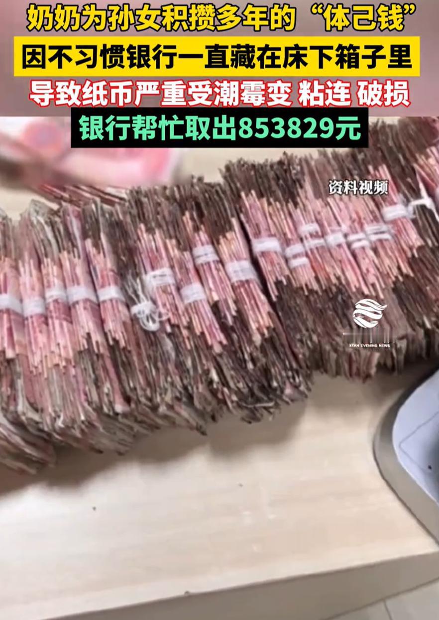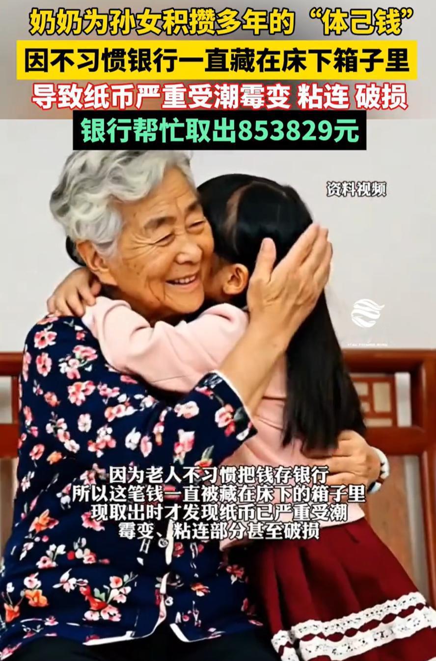 差点好心办坏事!江苏海安,一位奶奶疼爱孙女,多年攒下85万多的“体己钱”,一直放在床底的箱子里面,就等着孙女出嫁的时候给她,可没想到,真要给的时候,却发现这些钱已经受潮霉变,最后孙女带着奶奶一起来到银行进行兑换 原来,奶奶不习惯把钱放在银行,就觉得在身边才最踏实,所以这些钱常年被她放在床底的箱子里,而这笔钱,是她悄悄为孙女准备的“体己钱”,一共八十多万,是她对孙女未来的一份心意,也是她心里最深的牵挂。她一直想着,等到孙女结婚那天,要亲手交给她,给她一个惊喜 可时间不等人,钱在箱子里,也悄悄变了样。等到孙女陈女士新婚不久回来看她,奶奶满心欢喜地搬出箱子,打开一看,两个人都愣住了,里面的纸币受潮发霉,有的黏在一起,有的边缘破损,原本崭新的钞票,已经面目全非 惊喜,瞬间成了惊吓 陈女士没有埋怨,她知道,这是奶奶一点一滴攒下的爱。她立刻带着奶奶去了银行,小心翼翼地把钱拿出来,请工作人员帮忙一张一张清点、鉴定 银行的工作人员也很耐心,花了很长时间,把每一张能兑换的纸币都整理了出来。最后,这笔“沉睡”多年的钱,成功兑换回853829元。钱,总算保住了;奶奶的心,也放下了 不得不说,这位奶奶不仅有钱,还真的疼孙女,能把八十多万塞在床底多年,这种用心已经不是简单的省吃俭用了,是把孙女当成生命里最软的一块地方 这事真正值得注意的是两点。第一,家里有老人喜欢存现金的,最好提前帮他们做个安全规划,别等到关键时刻才发现都坏了。比如准备个防潮箱,放几包干燥剂,定期拿出来翻一翻 第二,银行这次的处理也算给大家提了个醒,人民币受损其实是有明确兑换标准的,只要能看得出面额、序号、图案,基本都能换回来,不是说坏了就彻底没了。有不少人遇到受潮、发霉、洗衣机误洗,都以为赔光了,其实拿去银行让专业人员判断,能挽回的比你想象多