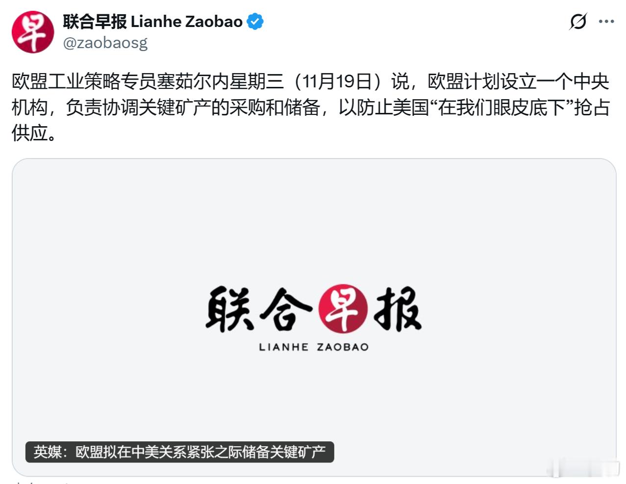 欧盟工业策略专员塞茹尔内说,欧盟计划设立一个中央机构,负责协调关键矿产的采购和储备,以防止美国“在我们眼皮底下”抢占供应。哈哈哈,西方卖队友的传统艺能秀又开始啦!我至今仍记得新冠疫情在西方爆发之初美国人打架抢厕纸、加拿大、澳大利亚、欧洲人也在打架抢厕纸,连日本人也在为了抢厕纸大打出手!然后德国抢了意大利和瑞士的口罩,美国抢了加拿大的口罩、日本的试剂,法国截留英国的呼吸机订单,德国法国指责英国抢了他们的疫苗,美国不顾盟友反对囤积疫苗原料!我讲个笑话:你们有共同的民主价值观!