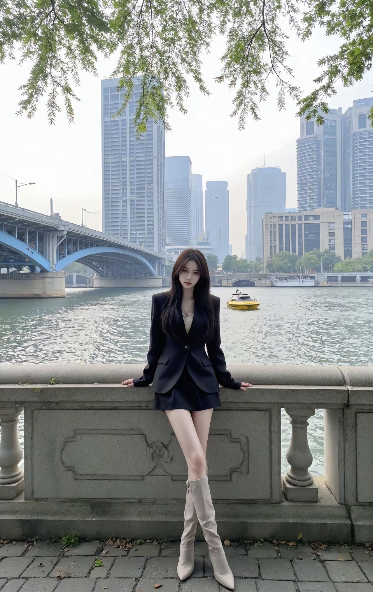 河畔的风裹着城市的轮廓,西装裙和长靴踩碎了江水的波纹,身后是桥与楼的错落,像把都市的干练揉进了春日的柔里。