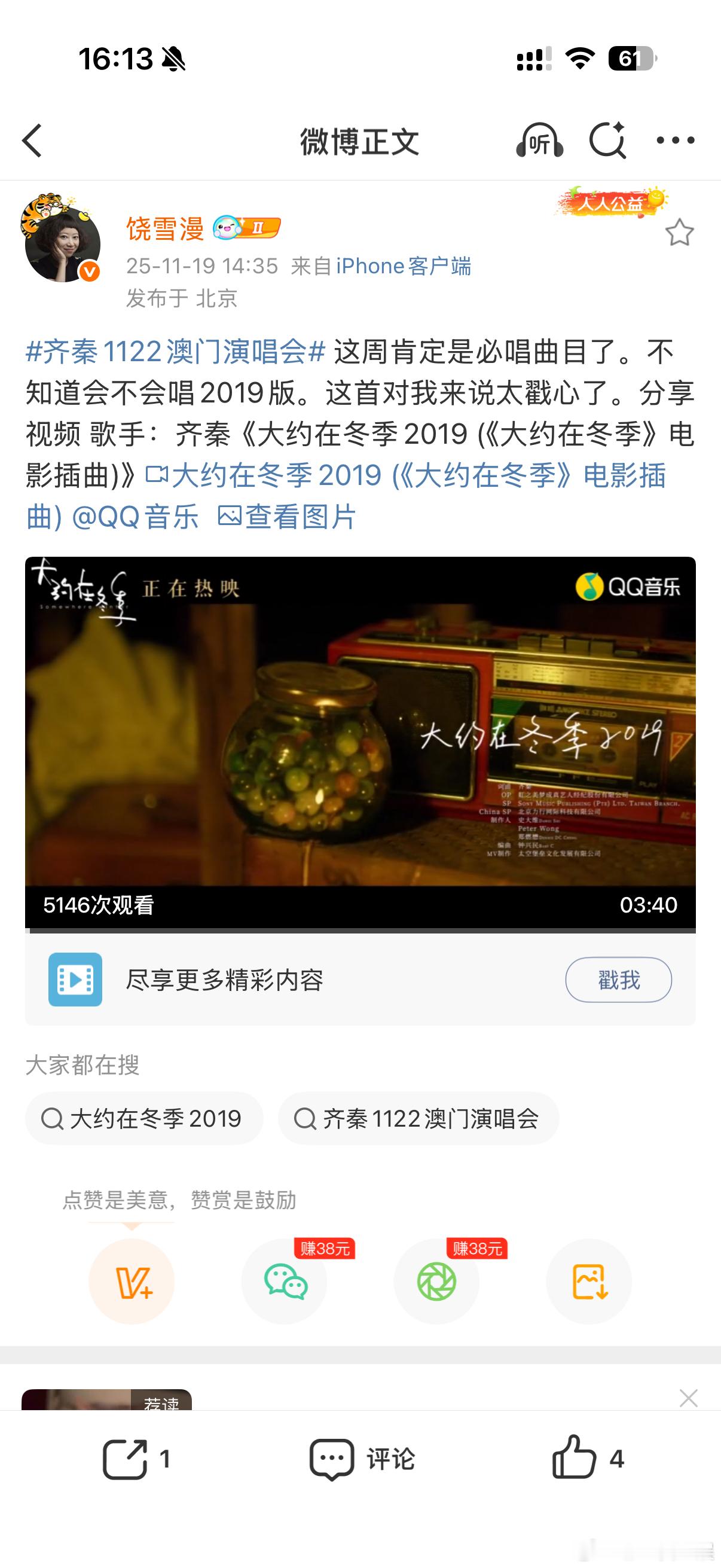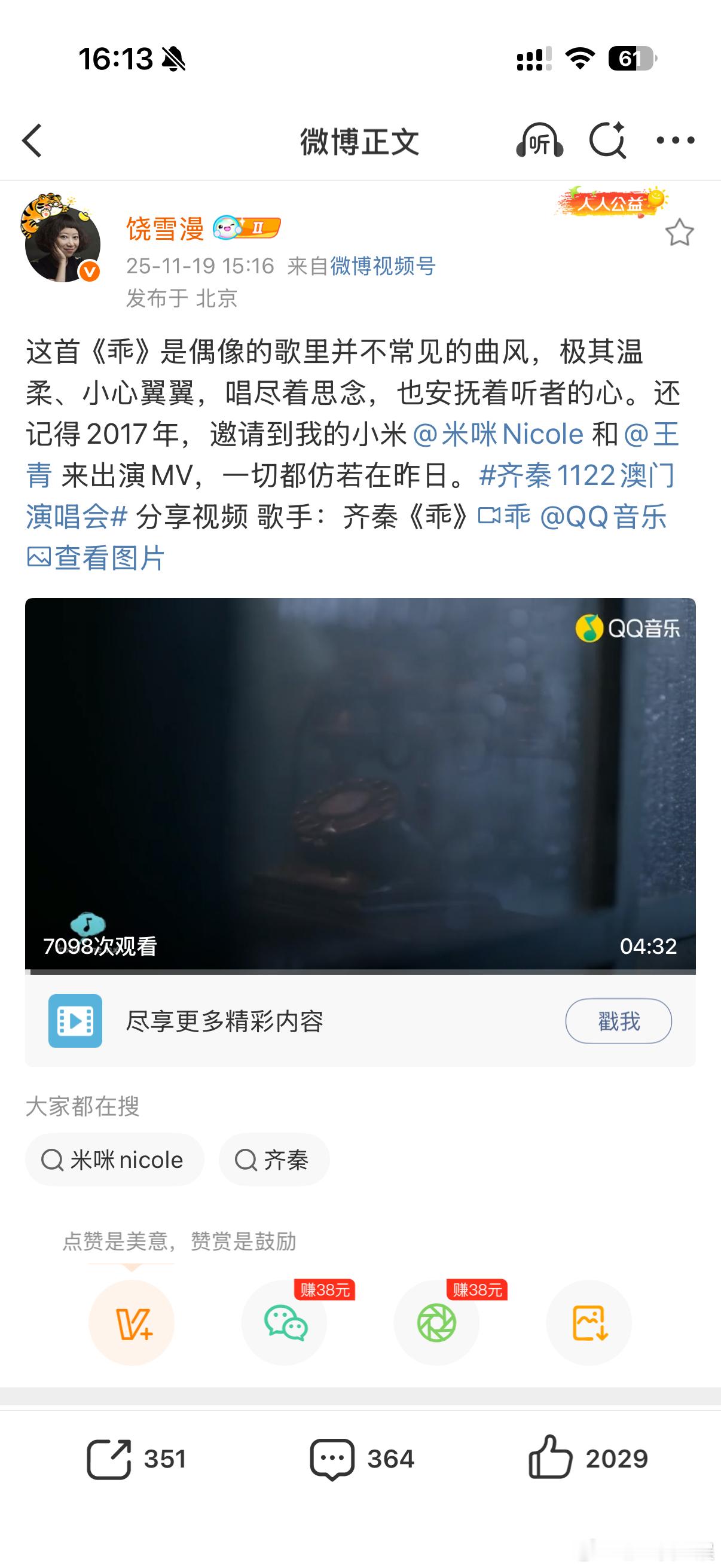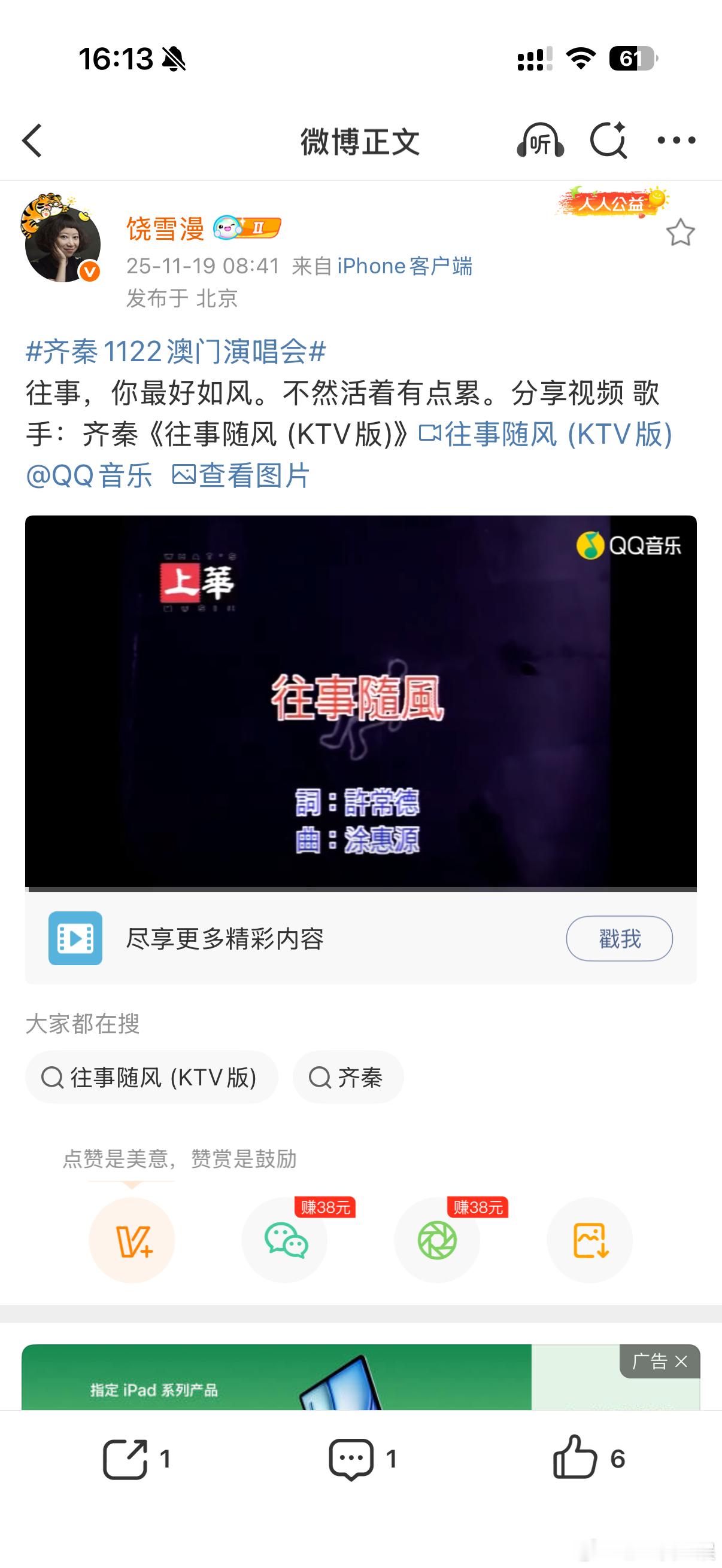 这才是追星天花板!从粉丝到相交10年的兄妹,饶雪漫的喜欢从不是短暂打卡,而是长久牵挂。齐秦1122澳门演唱会,她全力宣传,情怀与热度直接拉满~