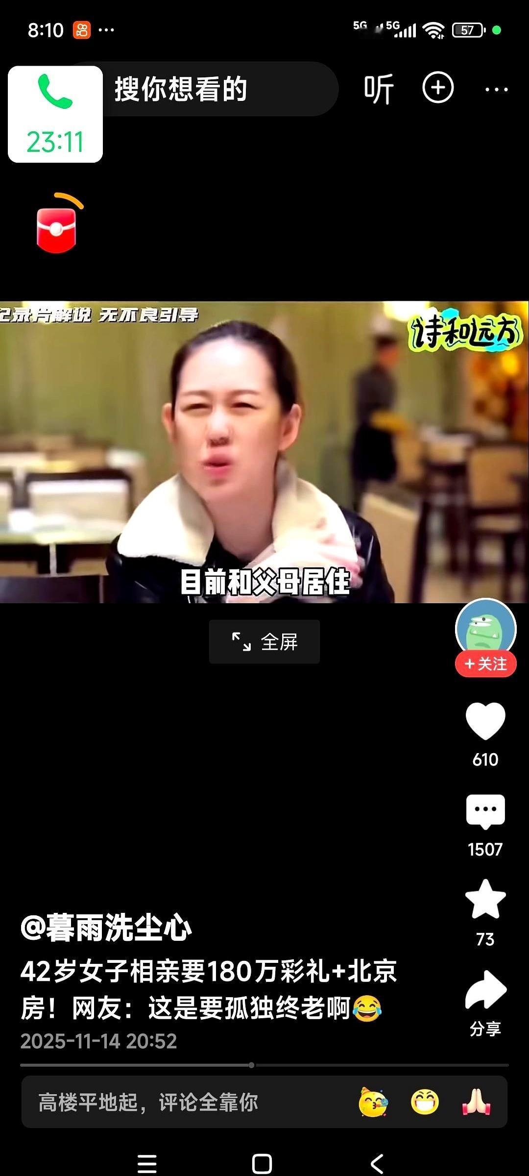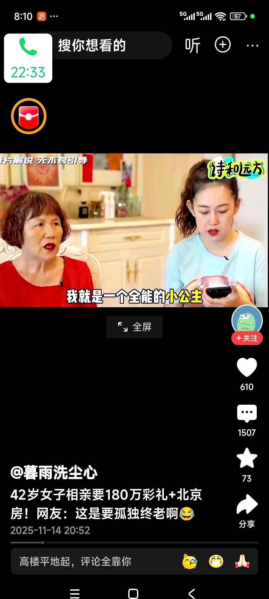 刚刷到一个事儿,差点没把我手机惊掉。 42岁,相亲,张口就要180万彩礼,再加一套北京的房。 我心想这是何方神圣,结果姐们儿特自豪地亮出了自己的核心竞争力:我会刷碗。 …… 空气突然安静。 我一时间竟分不清,这到底是喜剧还是悲剧。 她说自己是“全能小公主”,就等着她的霸总踩着七彩祥云来娶她。 大姐,醒醒,那是孙悟空的筋斗云,不是你家霸总的私人飞机。 有人说,根子都出在她妈身上。 我琢磨了一下,这话糙理不糙。 这哪是养女儿啊,这分明是在亲手给她建一个空中楼阁,然后把她推上去,告诉她:“闺女你别下来,下面都是凡人,你就在上面等着,你的王子总会来接你的。” 结果呢? 王子没来,阁楼摇摇欲坠。 说真的,一个女人最可悲的,不是42岁还没结婚。 而是都42岁了,脑子里还住着一个12岁的小女孩,手里攥着的唯一一张“王牌”,居然是“我会刷碗”。 这碗,得是金子做的吧。