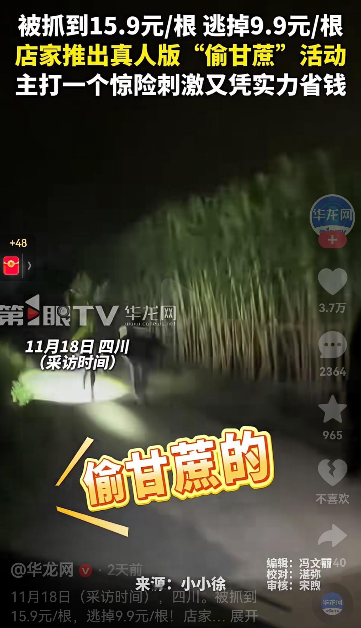还是现在人会营销!无限度满足顾客的愿望!近日,四川一甘蔗地老板为了让顾客体验一下童年的快乐,竟然推出“真人版偷甘蔗”活动。 老板特意给顾客准备手电筒和砍刀,还雇佣了几名员工和小狗。 只要顾客偷甘蔗,员工和小狗就在后面追,并大声呼喊,有人偷甘蔗了。 如果顾客被工作人员逮住,就按照一根15.9元付款,如果没有被逮住,就按照一根9.9元付款。主打一个惊险刺激又凭实力省钱的活动。 网友看到后评论说,万一被追的人摔倒受伤了,这个算谁的?这种做法虽然刺激,但是也有安全隐患的。 还有的网友说,还是商家有头脑有想法,这不比密室逃脱好玩吗? 还有的网友表示,如果换个游戏规则,比如说跑不掉的多收点,跑掉的不收,可能,参与活动会比现在人多。 商家为了满足顾客的需求,真的是下了血本,又是雇人,又是带狗的,听着就很刺激。 可是,无论如何,晚上上演这种小偷大战的游戏,一定要注意安全。千万不要太疯狂了,玩的太疯狂,很容易受伤的。 对此,你作何感想?欢迎大家评论区讨论留言。