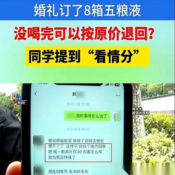 婚礼办完了,6箱五粮液砸手里了。 说好原价退的“好同学”,开口就是另一副嘴脸。 这事儿,比婚宴上没吃饱还让人堵心。 结婚是图个喜庆,找高中同学买酒,图个啥?不就图个方便、放心嘛。 人家同学也够“意思”,胸脯拍得山响:哥们儿,你尽管拿,8箱!喝不完的,一瓶不少,原价给我退回来! 听着多敞亮,多仗义。 结果呢?婚礼用掉2箱,剩下6箱,一拿回去。 “哎呀,这不巧了嘛,要放假了,得跟库房报备……” 拖着拖着,说辞就变了。 “你这箱子都拆了,影响二次销售啊。” “就算没拆的,现在行情也掉了,只能按770退。” “拆了的,750。” 一瓶酒,里外里差了一百多。这还不是最骚的。 哥们儿直接甩出杀手锏:我找验酒师看了,你这胶带是后封的! 这话诛心不?潜台词就是:你小子是不是给我掉包了? 看明白没? 这根本不是酒的事儿,也不是那几千块钱的事儿。 从头到尾,就是一场打着“同学情”幌子的算计。 当初满口答应“原价退”,就是个诱饵。他赌你婚宴上全喝光,赌你不好意思真来退,赌最后能把这几箱酒的利润稳稳吃下。 他根本就没打算兑现承诺。 所谓的“行业规矩”,所谓的“二次销售”,不过是早就准备好的台词。 成年人的社交,分两种人。 一种是真把你当朋友,生怕你吃亏;另一种,是把你当“待宰的客户”,嘴上全是情谊,心里全是生意。 可惜,很多人总是在付了学费之后,才分得清。 最贵的不是那几箱酒,是那句轻飘飘的“你放心”。 以后啊,亲兄弟明算账,白纸黑字比啥都强。
