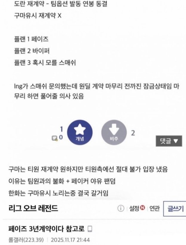 韩网爆料:Gumayusi和队友不合,绝对不续约,Plan2是Viper提前爆料了Peyz签约三年Doran续约Gumayusi不续约的瓜主:Plan1是Peyz,Plan2是Viper,Plan3万一不行就用Smash,LNG有打听过Smash但是合约结束之前是锁定状态,结束之后有放他走的意向。Gumayusi想要续约但是T1方面是绝对不续约的立场,理由是和队友不合还有粉丝方面的问题,HLE想要Gumayusi最后会去那里。