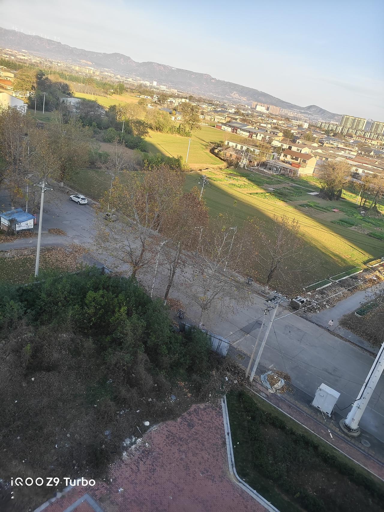 今儿早上八点多拍的这张图,感觉还挺有生活气息的。远处的山淡淡的,近处的树叶子有的黄了有的还绿着,路上有辆小白车停着,还有个人在溜达。城乡结合部的感觉,既有田野又有楼房,阳光洒下来,挺温暖的,就像生活一样,不那么精致但很真实。