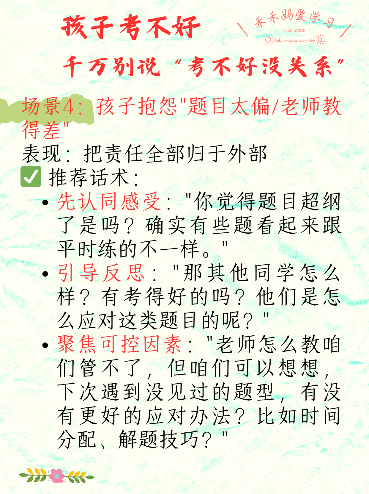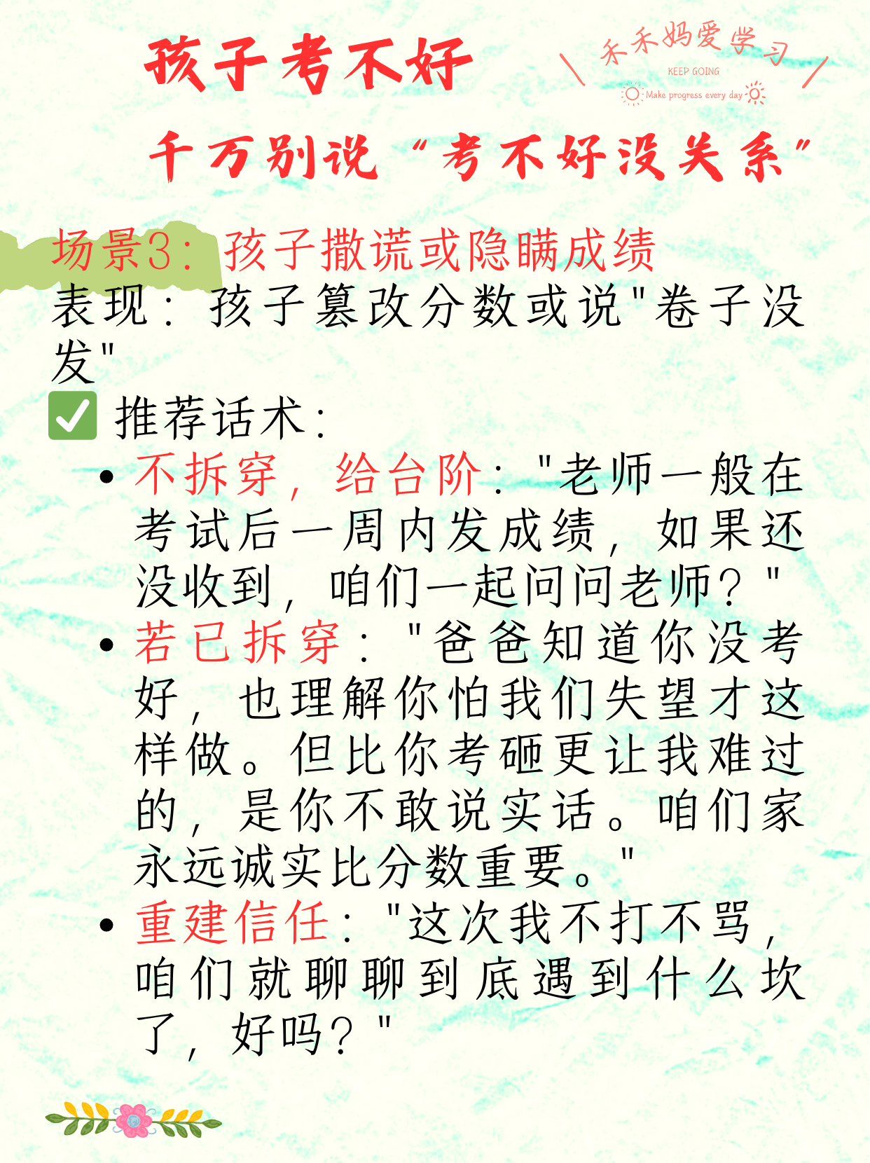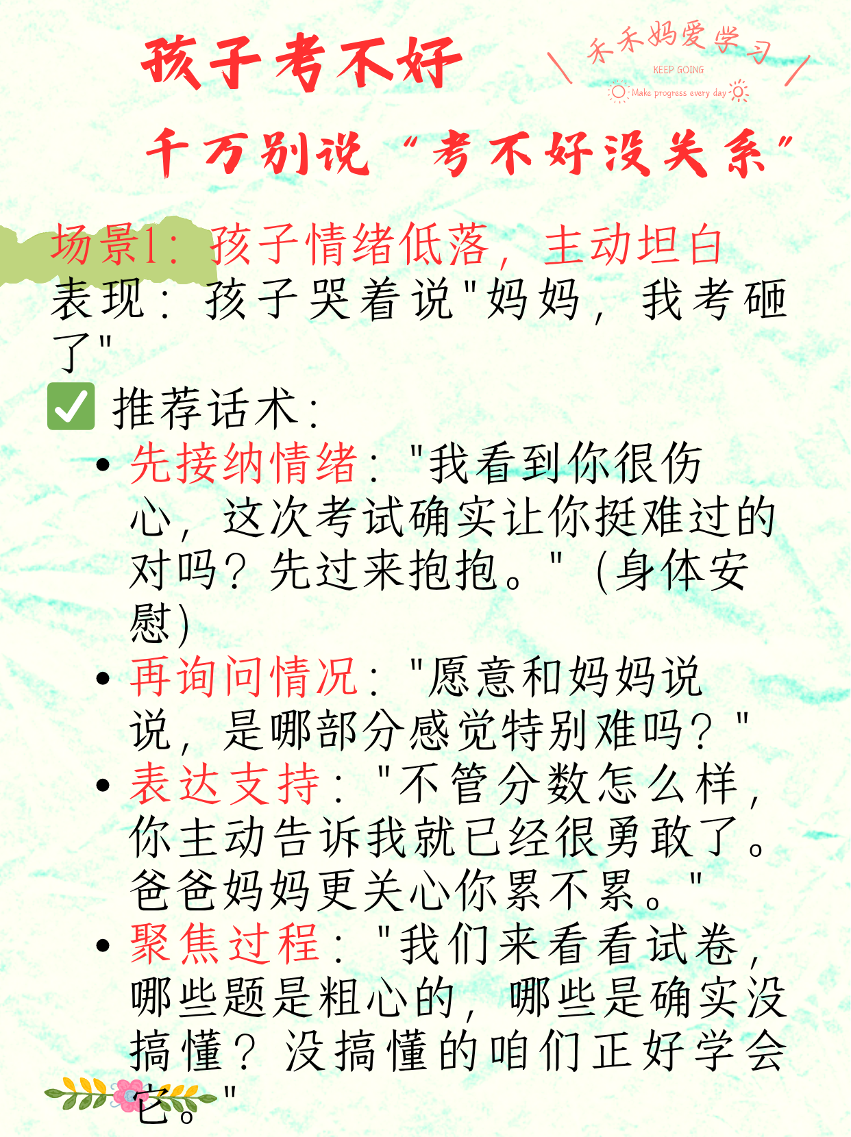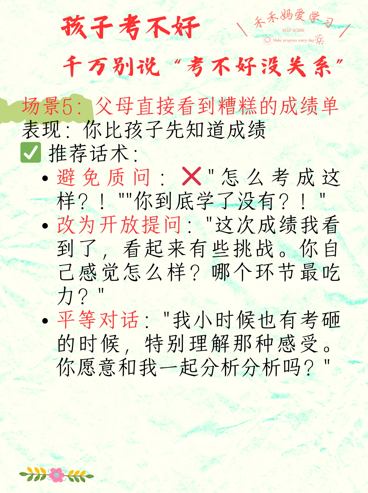 以下几张图,是孩子成绩不理想,常见场景及具体话术,原则就是先链接感情,再纠正行为,让孩子感受到“父母在意的是我,而不是我的成绩”,这样做不仅能激发孩子的内在学习动力,更有利于亲子和谐。