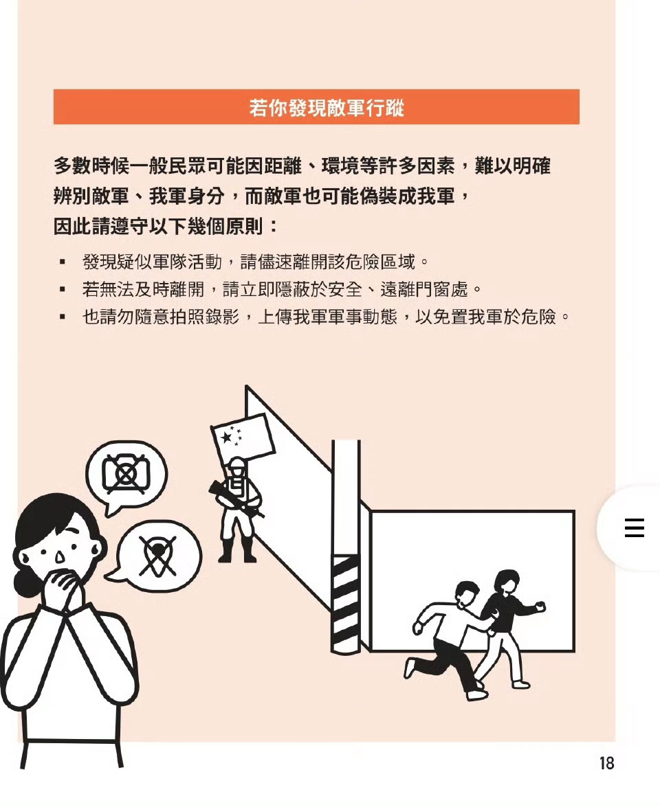 🔻就是这个之前发过,台湾首次向全台家庭发放“民防手册”的新闻。🔻台军现在是从之前的滩头反冲击策略,逐渐开始转变成依托城市顽抗,一系列演练包括但不限于装甲车坦克藏居民楼酒店,防空架在公园,火炮架在小学幼儿园。🔻旨在利用民众当肉盾,利用居民区当掩体,还以为台湾是当年1949年上海吗?