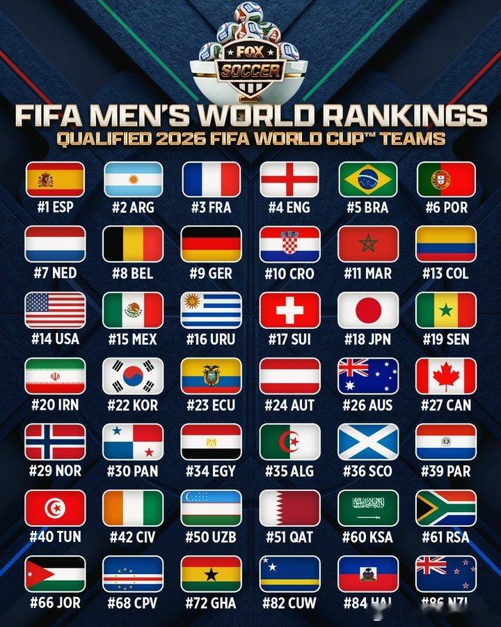 FIFA官方公布新一期国家队排名↓1-西班牙2-阿根廷3-法国4-英格兰5-巴西(⬆️2)6-葡萄牙(⬇️1)7-荷兰(⬇️1)8-比利时9-德国(⬆️1)10-克罗地亚(⬆️1)11-摩洛哥(⬆️1)12-意大利(⬇️3)13-哥伦比亚14-美国(⬆️2)15-墨西哥(⬇️1)16-乌拉圭(⬇️1)17-瑞士18-日本(⬆️1)19-塞内加尔(⬇️1)20-伊朗(⬆️1)亚洲球队及国足排名👉()