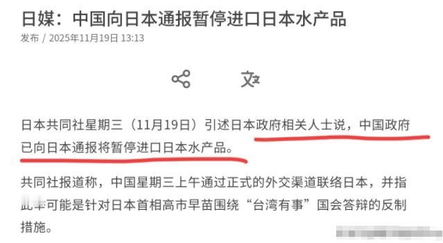 开始动手了!中国对日本实质性反制即将开始!11月19日,根据日本共同社报道,日媒引述日本政府相关人士说,中国政府已向日本通报将暂停进口日本水产品。 从11月19日中国正式通报暂停进口日本水产品这件事就能看明白,所谓的实质性反制从来不是突然发难,完全是日本首相高市早苗一步步把局面推到这一步的,说白了就是搬起石头砸自己的脚。 要知道,中方做出这个决定前可不是没给过机会,11月7日高市早苗在国会答辩时公然宣称“台湾有事”可能构成日本行使集体自卫权的“存亡危机事态”,这种话可不是随口说说的玩笑,这是1945年日本战败后,首位日本领导人在正式场合把台海问题和武力介入绑定,直接踩了中日关系的核心红线。 消息一出,中方立刻就有了反应,外交部、驻日大使接连召见日方官员严正交涉,等于明着给日本递了台阶,可高市早苗硬是不接,既不撤回言论也不道歉。 更有意思的是,日本外务省亚洲大洋洲局长金井正彰11月17日还紧急跑到中国搞公关,说这言论不代表日本政策转变,想蒙混过关,结果刚谈完两天,水产品进口暂停的通知就到了,这态度已经很明确:光靠嘴皮子“灭火”没用,得拿出实际行动来。 要说这反制有多精准,看看日本水产业的处境就知道了。作为岛国,渔业可是日本数百万民众的生计根本,而中国长期以来就是他们的“生命线”,巅峰的时候,日本每出口10斤海鲜就有4斤卖到中国,占了总出口量的五分之一还多,有些品类甚至达到42%的占比。 2022年一年,日本对华水产品出口额就有数百亿日元,这可不是小数目。更关键的是,这已经不是中方第一次因为日方失信出手了,2023年8月日本强行排核污染水,中方直接全面暂停进口,结果日本对华水产品出口几乎归零,2023到2024年的损失就超过500亿日元,折合人民币25亿多。 后来日方反复承诺会提供安全技术材料、接受中方独立检测,磨了一年多,中方才在今年6月松口,恢复了37个非高风险地区的进口。 就在这个月月初,首批6吨北海道冷冻扇贝刚运到中国,日方还高调喊这是“历史性时刻”,计划11月再出口海参,结果才过14天,就因为高市早苗的一句话全黄了。这些靠海吃饭的日本渔民怕是要哭晕,刚看到点希望就被自己的首相亲手掐灭了。 而且这事儿的影响远不止渔民卖不出海鲜那么简单。日本2024年上半年农林水产品出口已经是四年来首次下滑,总出口额才7013亿日元,其中对华出口骤降43.8%,海鲜更是跌了92.3%,只剩35亿日元。 现在进口一暂停,冷链物流、包装加工、甚至日料相关的餐饮行业都得跟着倒霉,地方税收和就业都会受牵连,这就是典型的“一人犯错,全行业买单”。 其实中方的态度从外交部发言人毛宁的回应里就能看得清清楚楚,一方面点出日方没兑现提供技术材料的承诺,另一方面直接挑明,高市早苗的错误言论已经激起了中国民众的公愤,就算现在开放进口,日本水产品在中国也没市场。 这话可不是吓唬人,中国消费者对日本水产品的信任本来就因为核污染水事件打了折扣,现在首相还在台湾问题上挑衅,谁还愿意买? 更有意思的是,日本国内都看不下去了。拥有260万粉丝的网红西村博之直接在社交媒体上怒批右翼政客短视,说一旦中国停止出口,日本化肥、粮食、稀土都会出问题,高科技产业都得停摆。 还有三位前首相站出来警示,媒体社论骂高市言论鲁莽,上百名民众在首相官邸前喊“高市下台”,连《社会新报》都直接说“高市作为首相的存在本身才是日本的存亡危机”。这局面下,高市早苗就算想硬撑,国内的压力也扛不住。 别忘了,暂停水产品进口还只是个开始。之前中方已经发布了赴日旅游和留学预警,中国游客2025年前九个月就有748万人赴日,消费占了所有外国游客的四分之一,要是游客真的大幅减少,日本GDP可能要被拉低0.36%,损失约2.2万亿日元。 毛宁已经明着警告,要是日方不回头,更严厉的措施还在后头,稀土出口管制、贸易合作降级这些都在选项里。日本高科技产业本来就依赖中国稀土,真到那一步,哭都没地方哭。 2025年还是抗战胜利80周年、台湾光复80周年,这个节骨眼上,作为二战战败国的日本首相公然暗示武力介入台海,本身就是对战后国际秩序的挑衅。 中方这次反制,不光是给日本提个醒,也是给所有想在台湾问题上搞小动作的域外势力看的:红线碰不得,碰了就得付出代价。高市早苗要是还执迷不悟,要么就得收敛言行让外务省来“擦屁股”,要么就可能成为又一个“短命首相”,毕竟谁也不想跟着一个只会惹麻烦的领导人过日子。 说到底,这事儿从头到尾都是高市早苗自作自受。10月底中日领导人会谈时,日方刚在涉台问题上做了承诺,不到两周就翻脸不认人,这种出尔反尔的操作怎么可能赢得信任。中方给了机会,是日本自己没抓住,现在反制来了,再喊冤也没用,毕竟路是自己选的,后果也得自己扛。