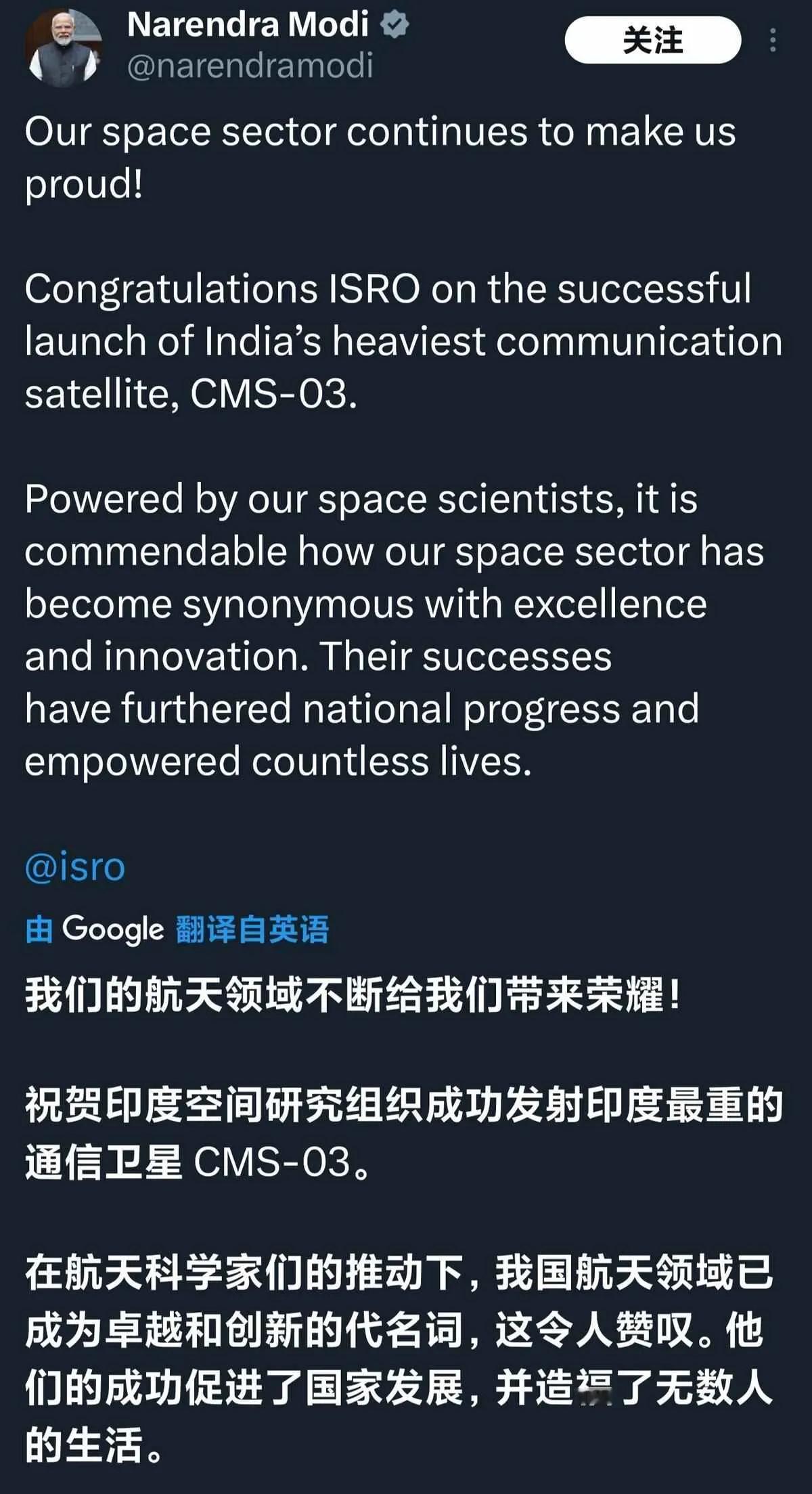 印度火箭发射偏了,卫星靠自己“爬”上去,技术测试藏玄机 11月2日那天,印度用LVM3-M5火箭发射了一颗重达4.4吨的通信卫星CMS-03,按照原计划应该把它送到29970公里的高度,但最后只到达26569公里,差了3401公里——正好落在他们官方说的±3700公里误差范围里面,为什么会出现这种情况呢,因为火箭为了多装载一些货物,把燃料烧到最后一滴才关闭发动机,这样一来精度自然就没办法得到保证。 卫星没有白白飞行,它靠着自己的发动机慢慢移动到目标轨道,但付出的代价是寿命缩短了两到三年,更让人意外的是,这次任务悄悄测试了二级发动机的二次点火技术,这个技术原本可以等到下次燃料充足的时候再进行测试,现在提前进行试验,说明他们确实有些着急。 11月3日这天,印度又做了一次载人飞船“加冈扬”的降落伞空投试验,用伊尔-76飞机把模型舱扔到空中,这已经是他们做的第四次这类试验了,可要是拿中国的情况来对比,人家在2002年一个月里就完成了五次同样的试验,印度这边进度明显慢了不少,连基础验证这一步都还没做完。 印度航天 LVM3火箭