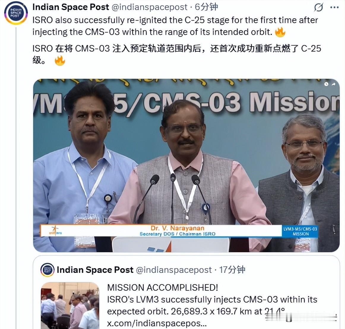 印度又整活了 印版长征五号误差3700公里! 莫迪吹的“印度荣耀”,原来是算好的“翻车KPI”? 新火箭LVM3-M5首发,把4.4吨卫星送上天,误差却高达±3700公里! 莫迪夸它是“印度之光”,可ISRO自己PPT写得明明白白:远地点目标29970公里,实际26569公里,差出一个海南岛到东北的距离。 这哪是“发射失误”?分明是印度航天自创的“薛定谔式精准”——发射前就算好误差范围,事后还能腆着脸说“一切尽在掌握”。 更绝的是操作细节:火箭本就超载(设计运力4.1吨,硬塞4.4吨),偏要玩“耗尽关机”,烧光燃料赌一把,结果精准翻车。卫星被迫自己爬3400公里轨道,燃料烧掉两三年寿命——合着卫星是来“负重拉练”的? 最魔幻的是,印度还偷偷留了燃料搞二级点火测试。明明下次发射燃料管够,偏要在关键任务里“练手”。这脑回路,像极了学生考试前不复习,偏要在考场上练新题型。 再看载人航天:11年只做了4次降落伞试验,今年8月才完成第一次综合空投。神舟飞船5年几十次试验,印度倒好,“慢慢来,急啥?” 印度航天的逻辑很清晰:数据可以编,误差可以说,进度可以拖。反正吹够了“印度速度”,至于能不能把人送上天?等下次再说吧! 毕竟对他们来说,发射成功的新闻稿,比卫星能不能用、飞船安不安全,重要多了。 你觉得印度这“算好的误差”,是技术自信还是掩耳盗铃?评论区聊聊,印度的“航天荣耀”你信几分?