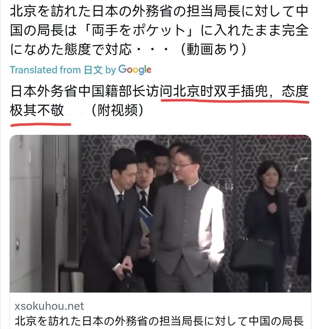 中日会谈结束,日本国内破大防,批评中国外交官态度极其不敬,称这是对日本的不尊重,对刘劲松双手插兜的动作很不满,当然了,对金井正彰也有批评,指责他对中国态度过于恭敬,像学生给老师认错一样,日本不该如此卑微。 这次会谈原本是给日本一个缓和局势的机会,但日本未能表现出诚意,拒不撤回之前的争议言论。因此,刘劲松的姿势被视为一种克制的信号,表明中国在应对日本的不当行为时,已经保持了最大限度的忍耐。 这不是简单的失礼,而是通过肢体语言传递信息:对待不友好的行为,中国不会一味示弱。 况且,日本先挑衅,还指望我们客客气气? 孔子曾说过:“以直报怨,以德报德”,意思是用公正回报怨恨,用恩德回报恩德。在这里,中国通过这种姿态传达了一个明确信号:如果日本不撤回不当言论,中国也不会虚伪地强装笑脸。 日本方面的反应,可以用“小题大做”来形容。他们强调外交礼仪,却忽略了问题的根源——日本先前的言论已经伤害了中国的利益和感情。这让人想起成语“只许州官放火,不许百姓点灯”,日本自己率先挑起事端,却要求中国保持谦恭,这显然不公平。 正如国际关系学者所言:"弱者才需要刻意强调尊严,强者只需保持从容。" 中方外交官的淡定,恰恰源于国家实力带来的底气。 正所谓,你敬我一尺,我敬你一丈。如果日本继续坚持错误立场,中国自然会调整应对方式。这不仅是维护国家尊严,也是向国际社会展示中国的外交原则:不惹事,也不怕事。 借用一句俗语“老虎不发威,别当病猫”,中国通过这样举动提醒日本,任何轻视都可能带来后果。