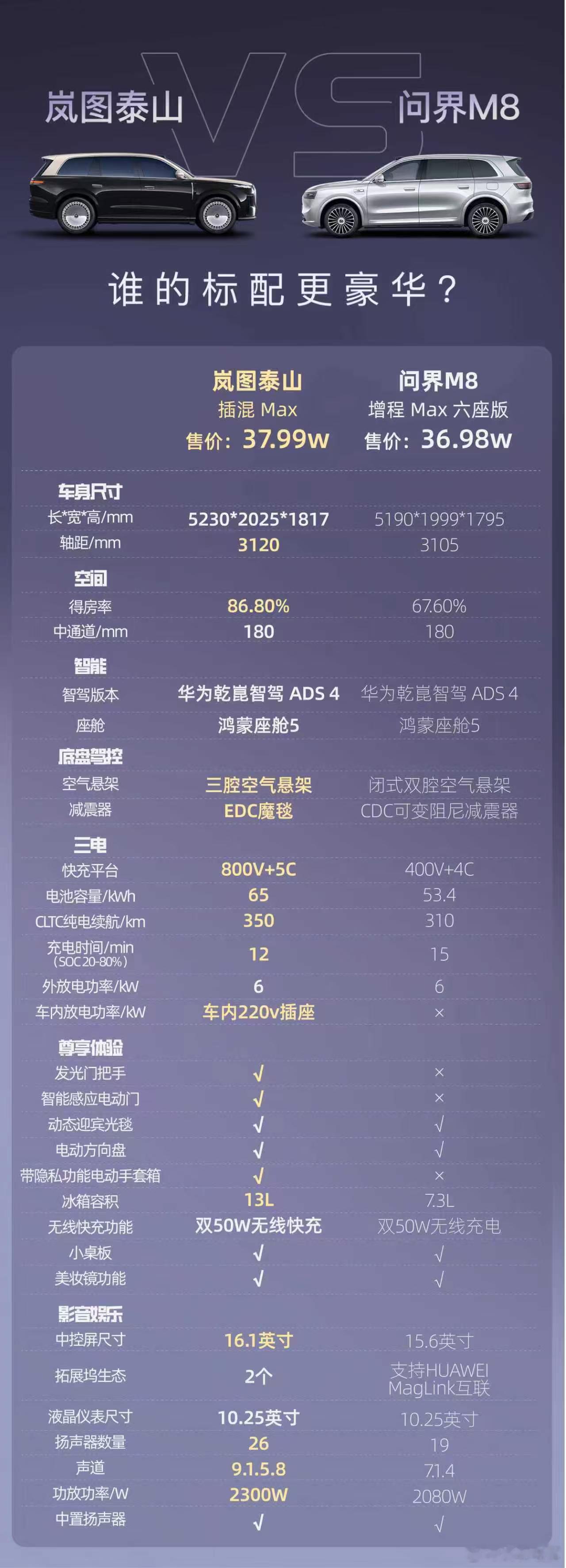 双华系对决:谁才是最优选?同样是30多万的预算,岚图泰山和问界M8,到底谁的标配更豪华?一边是岚图泰山那肉眼可见的满配豪华,三腔空悬+大空间+长续航+800V+5C超充+满血华为,钱都花在了刀刃上;一边是问界M8背后熟悉的华为生态,用着顺手安心。这下选择困难症都犯了,欢迎大家评论区留下你的选择~