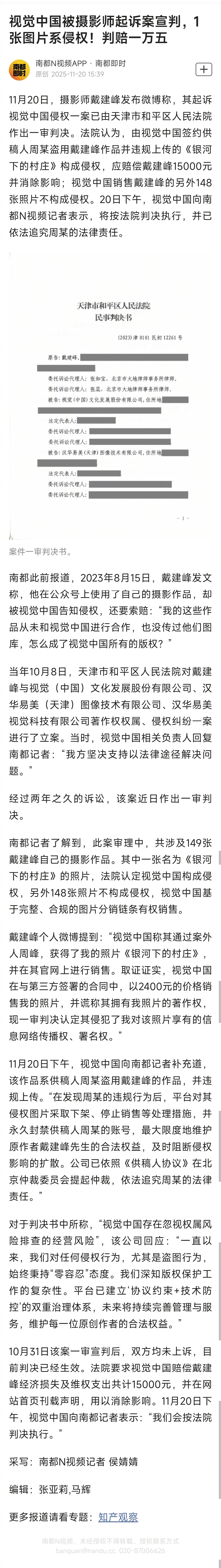 【,1张图片系侵权!判赔一万五】11月20日,摄影师戴建峰发布微博称,其起诉视觉中国侵权一案已由天津市和平区人民法院作出一审判决。法院认为,由视觉中国签约供稿人周某盗用戴建峰作品并违规上传的《银河下的村庄》构成侵权,应赔偿戴建峰15000元并消除影响;视觉中国销售戴建峰的另外148张照片不构成侵权。20日下午,视觉中国向南都N视频记者表示,将按法院判决执行,并已依法追究周某的法律责任。