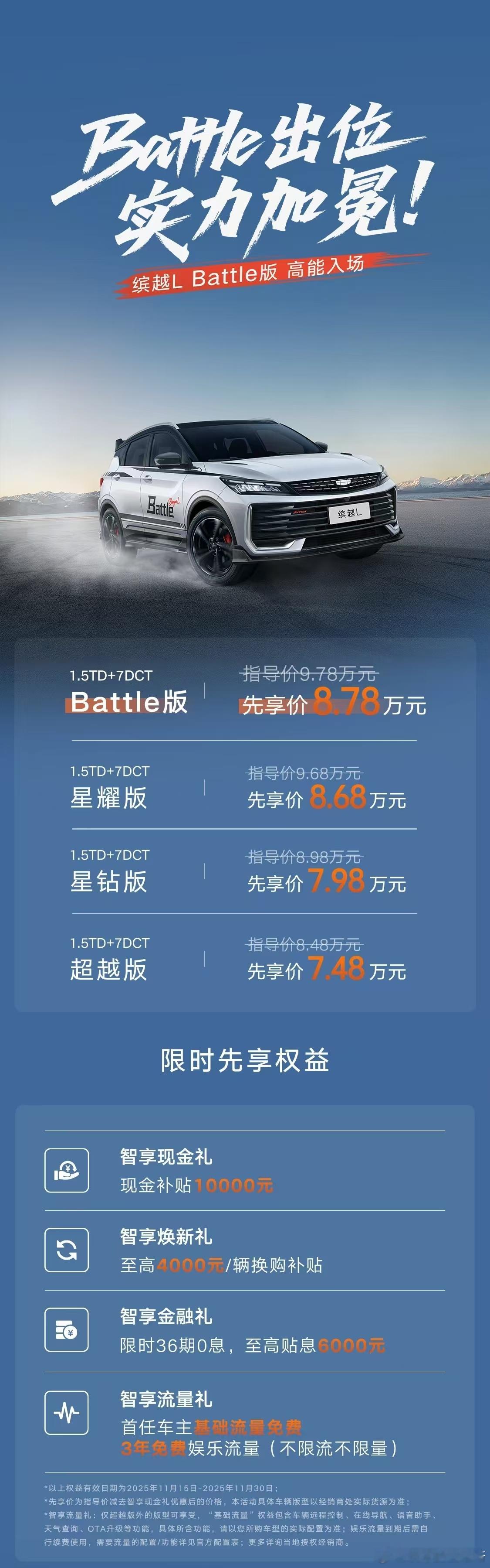 刷到吉利缤越L Battle版,我换车的DNA直接蹦起来了!这哪是SUV啊,分明是“卷王本王”——外观帅得像刚从赛道下来,四出排气+大尾翼,开出去回头率比我上班摸鱼被抓还高😎 内饰那麂皮座椅一坐,直接把“运动感”焊在屁股上,连方向盘都在喊“快来踩油门”!更狠的是这价格:最低才7万多?相当于用买手机的预算提辆能跑7.6秒破百、还带智能座舱的车!现在我看我家那老车,越看越像“退休老干部”,换车的心思已经按捺不住了,谁也别拦我去4S店薅这波羊毛!