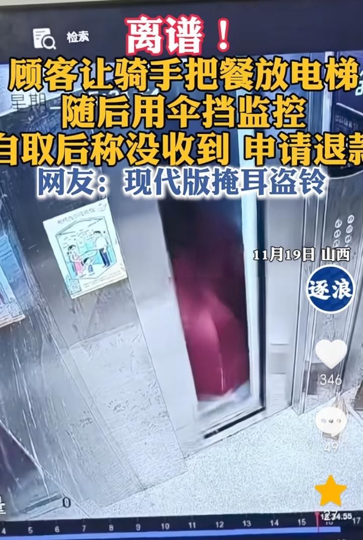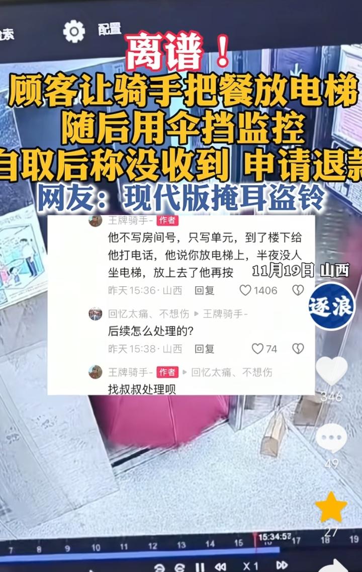 活不起了!山西,一顾客订餐不写房间号只写单元楼,外卖小哥到单元楼打电话对方让把外卖直接放电梯里,对方表示半夜电梯没人,外卖放了自己再按,没想到的是外卖小哥照做后顾客却是用伞遮挡监控取餐,取餐后有称自己没有收到外卖然后申请退款,事后外卖小哥已经报警处理。 事出反常必有妖,不写房间号只写单元楼,外卖小哥到地方后还让放电梯并没有让送上去,这一系列明显就不正常。 这位顾客真是活不起了,一顿外卖差不多也就一二十元,结果不想给钱想要白嫖,还上演了一出“掩耳盗铃”的把戏,真是不嫌丢人现眼的,吃不起就不要去点外卖,外卖小哥也是非常辛苦的,何苦要去害人家被扣钱。 有些不合常理的事大家一定要多加谨慎,因为这可能就是别有用心之人的一个骗局。